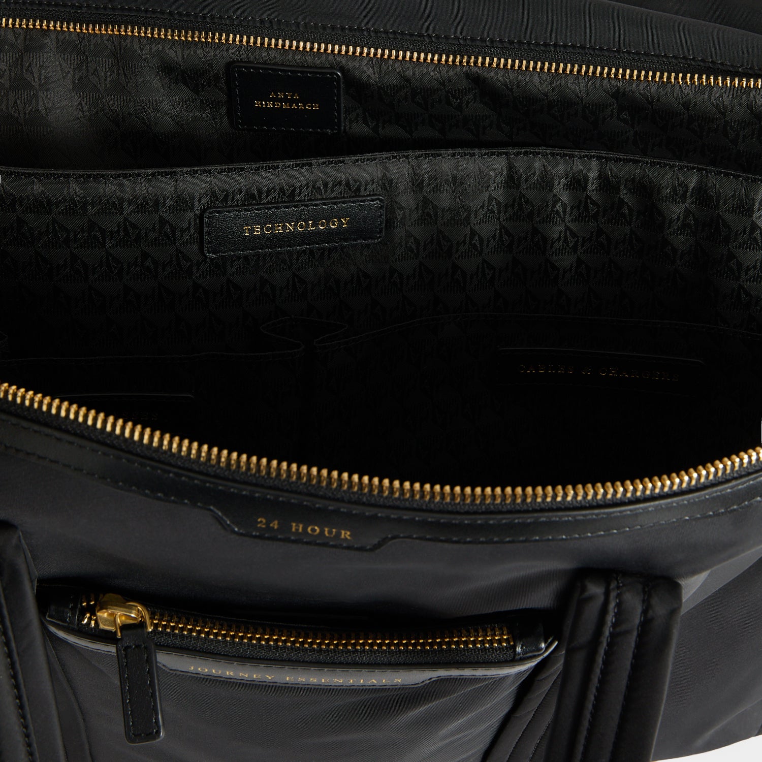 Section 2 unzips halfway to reveal labelled sections for TECHNOLOGY, GLASSES, and CABLES & CHARGERS