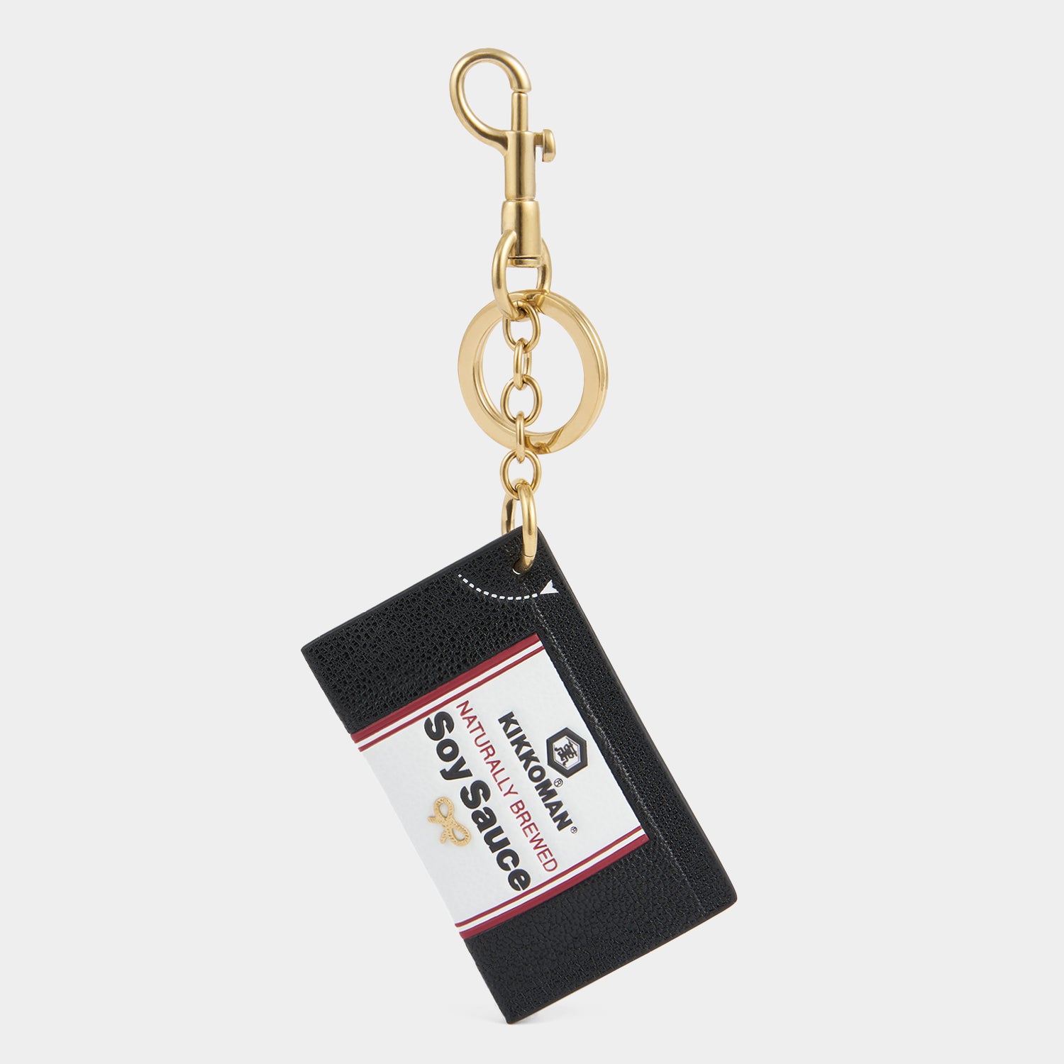 Kikkoman charm will be a fun addition to your favourite bag. Designed to resemble a sachet of our favourite sauce, it’s made from black capra leather, and detailed with the familiar logo and a ‘tear here’ symbol. Attach it to a tote using the golden clip.