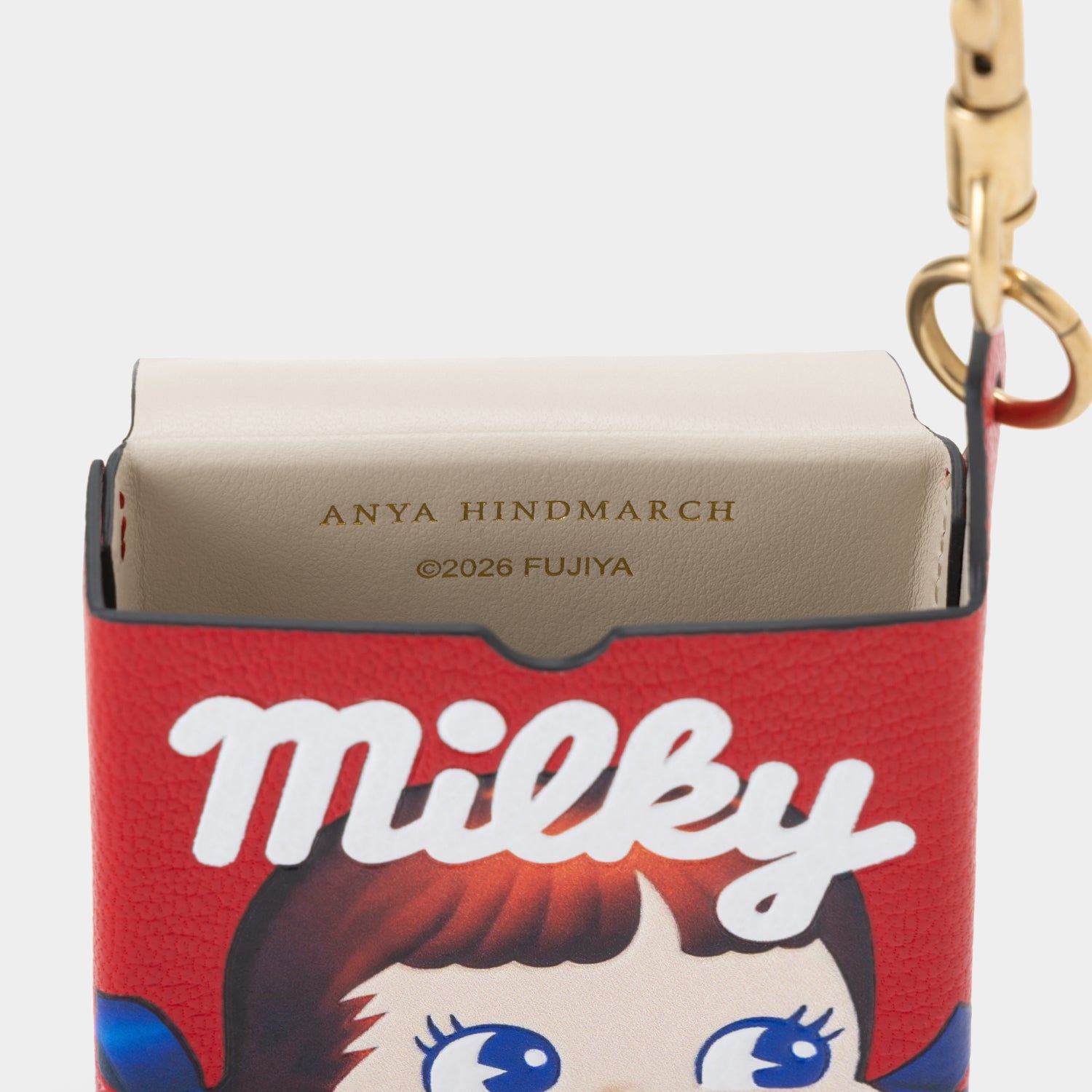 The Milky Charm will be a sweet addition to your everyday tote. It’s crafted from bright-red shiny capra leather and printed with artwork from the iconic Japanese candy, including the brand mascot, Peko-chan. Clip it onto a bag using the gold-tone clasp. ©2026 FUJIYA