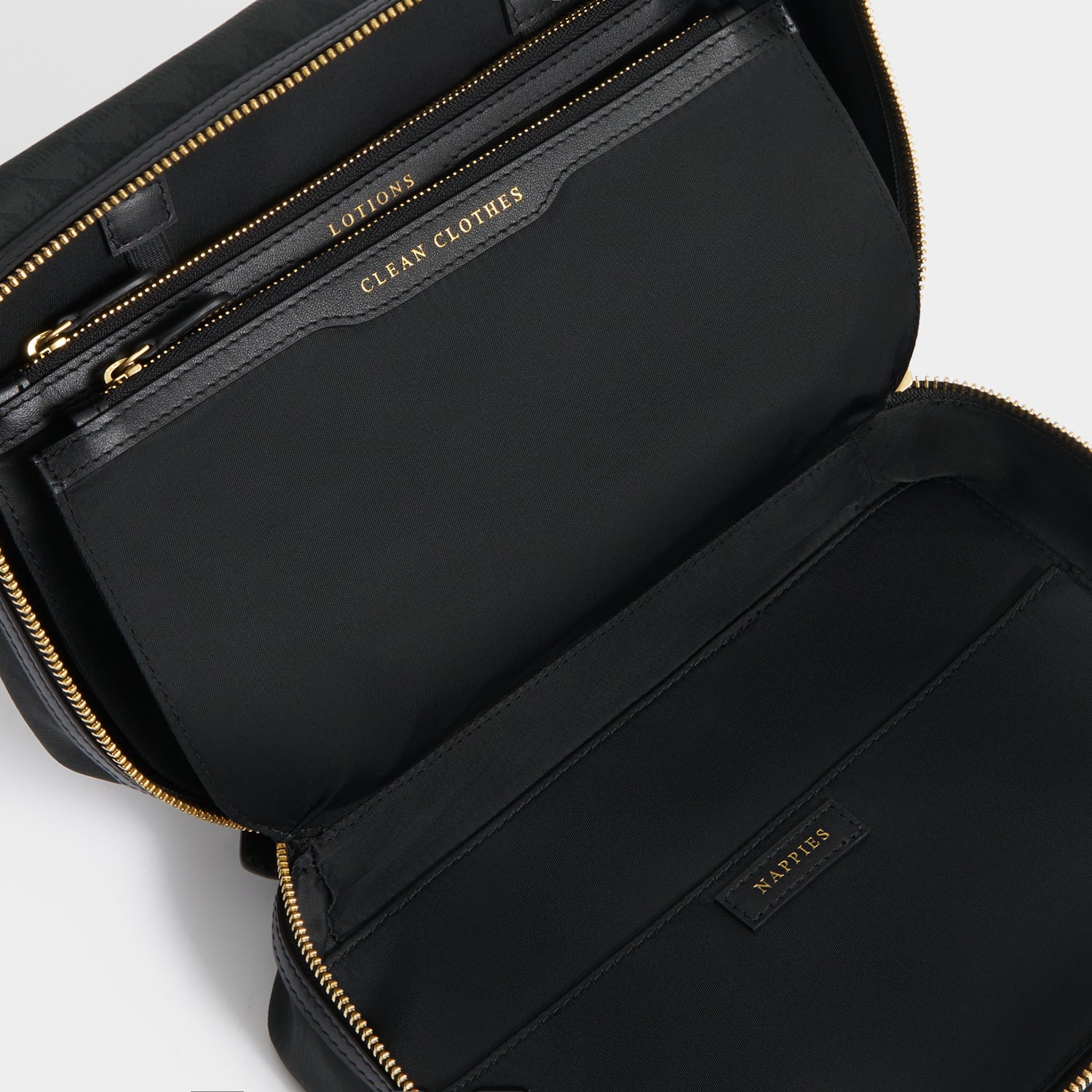 Internal features: Embossed fabric lining, changing mat, laundry bag, various labelled pockets and compartments.