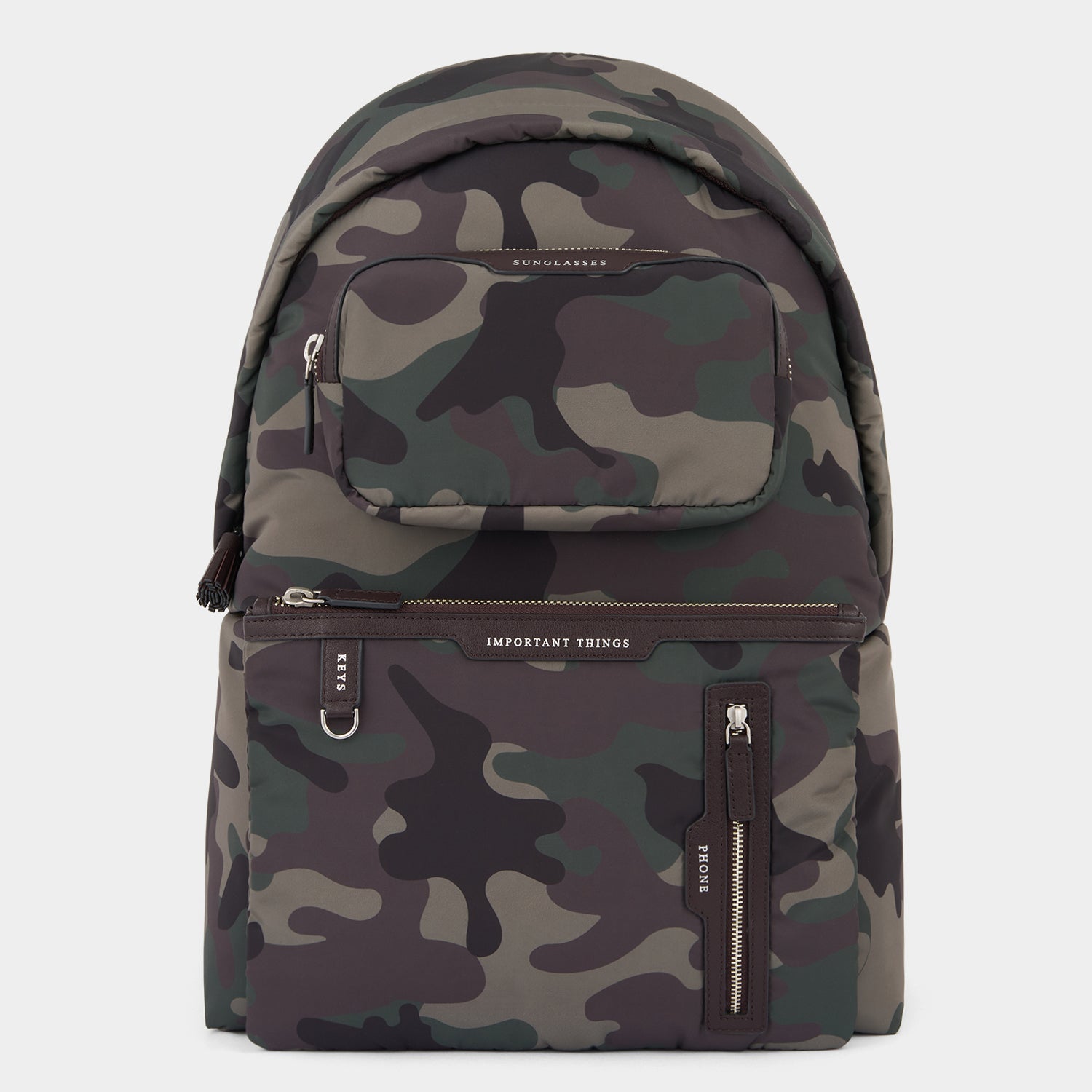 No ordinary backpack, ours is fitted with labelled compartments for optimum organisation. In the main section, there is a pocket for a laptop or tablet, and ample space for a book, pencil case, mini umbrella, and more. On the outside, we’ve added labelled, zippered pockets for your phone, sunglasses, and important things such as a passport or travel docs, as well as a key fob. It is made from camo-print, semi-recycled nylon and lined with orange recycled nylon.