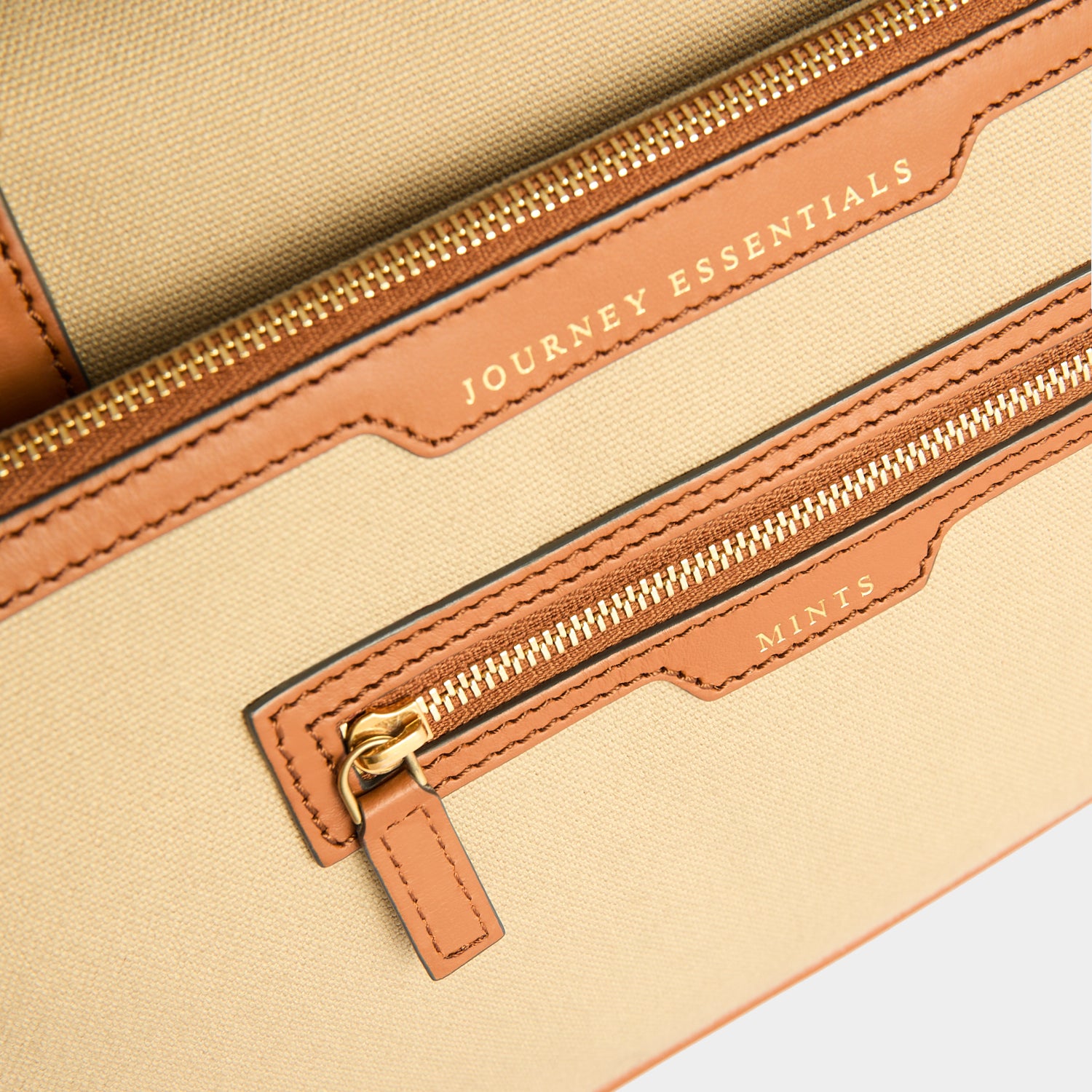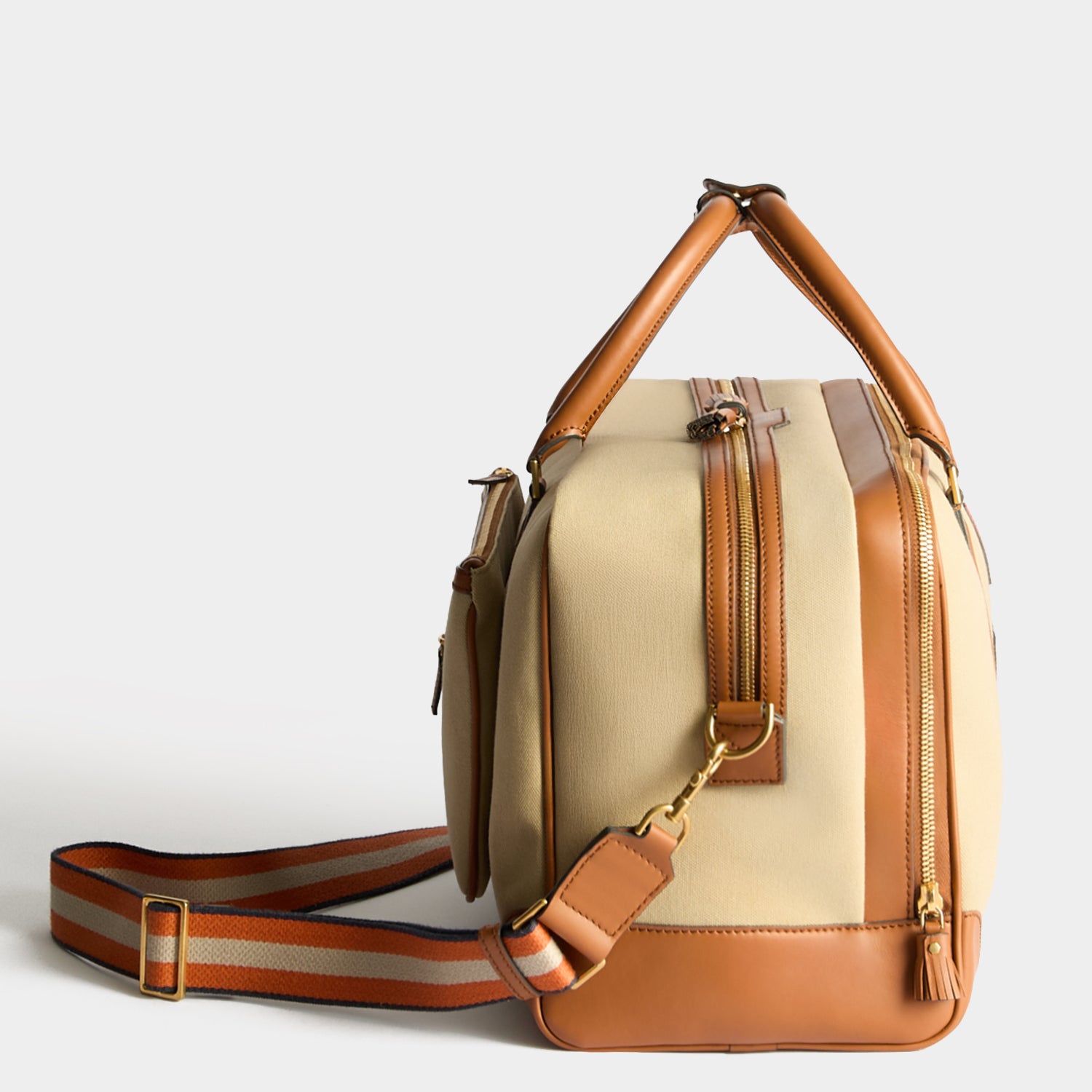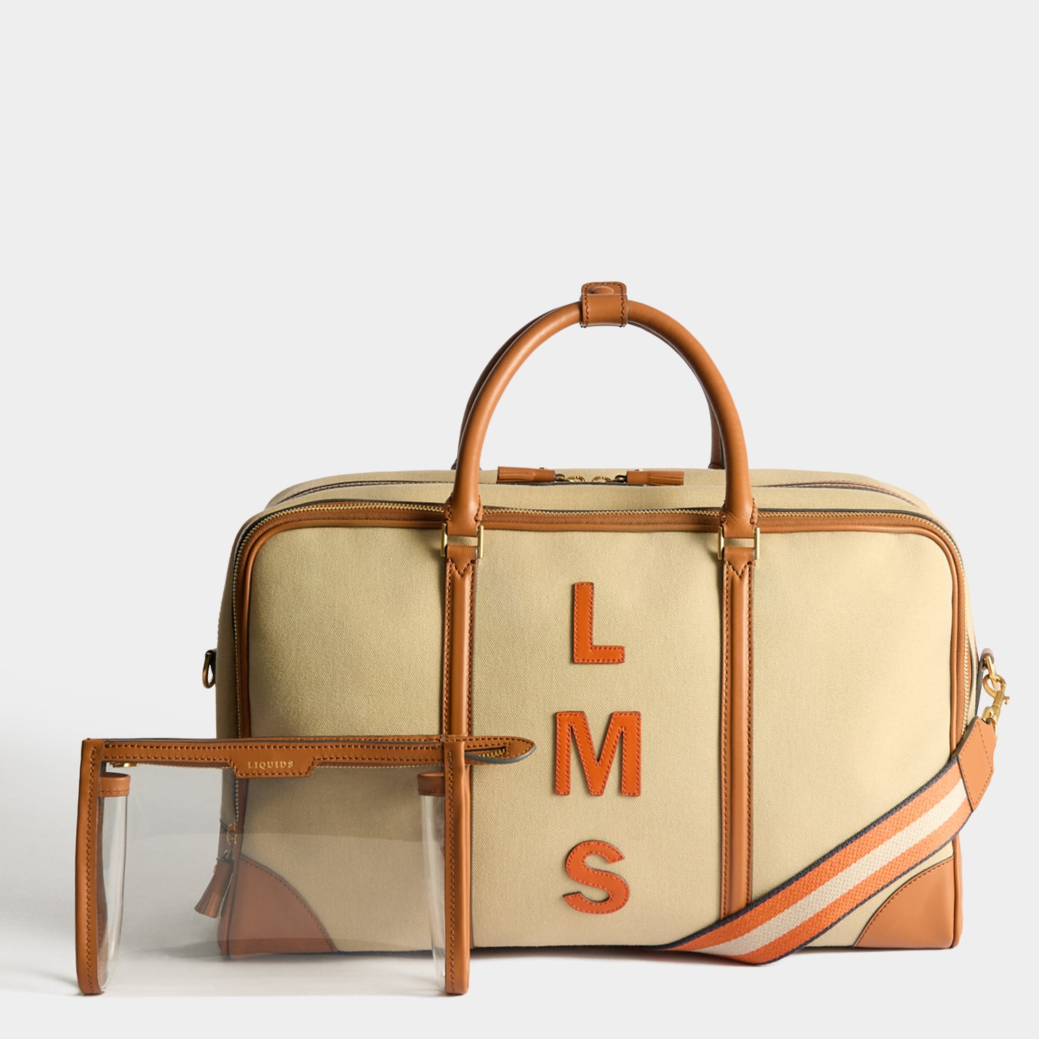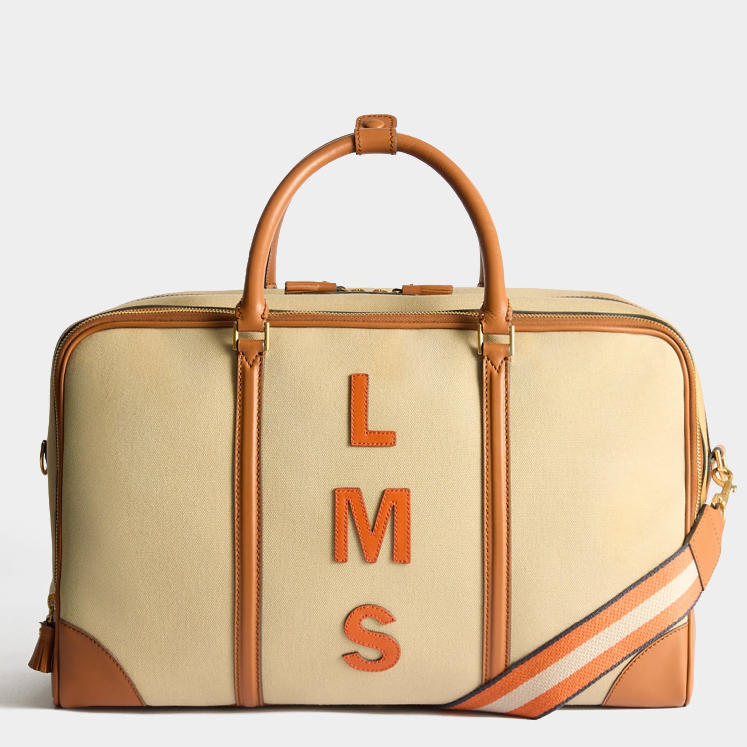External Features: Emboss initials, convenient sleeve, journey essentials pocket, double-tassel zip, top handles, long adjustable strap