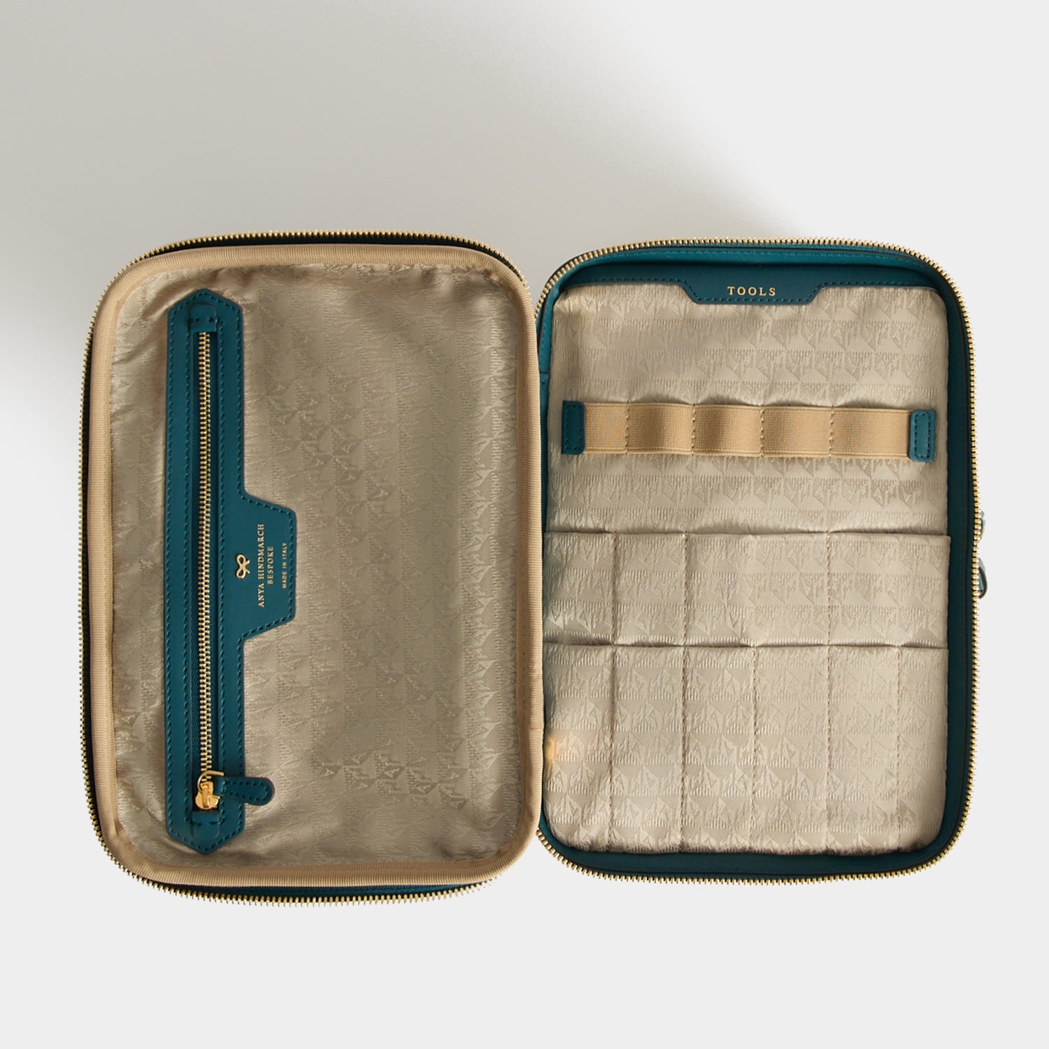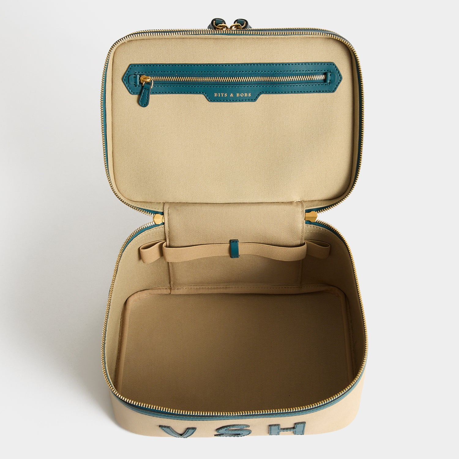 Internal features: Labelled tools section with space for 10 brushes and zipped compartment in top section, zipped pocket for BITS & BOBS, elastic bottle holders to keep your products upright when travelling in main section
