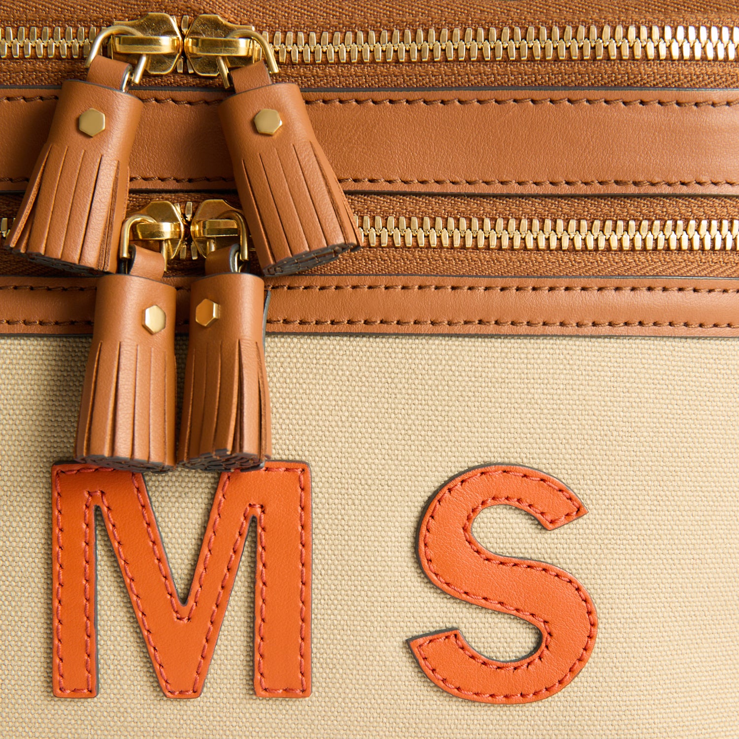 External features: Applique leather initials and a gold-embossed name, gold-tone zip with tassel zip pull