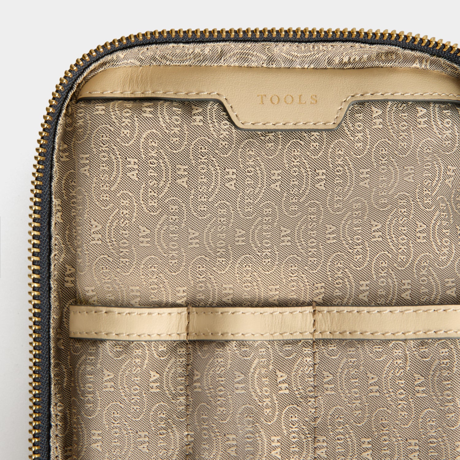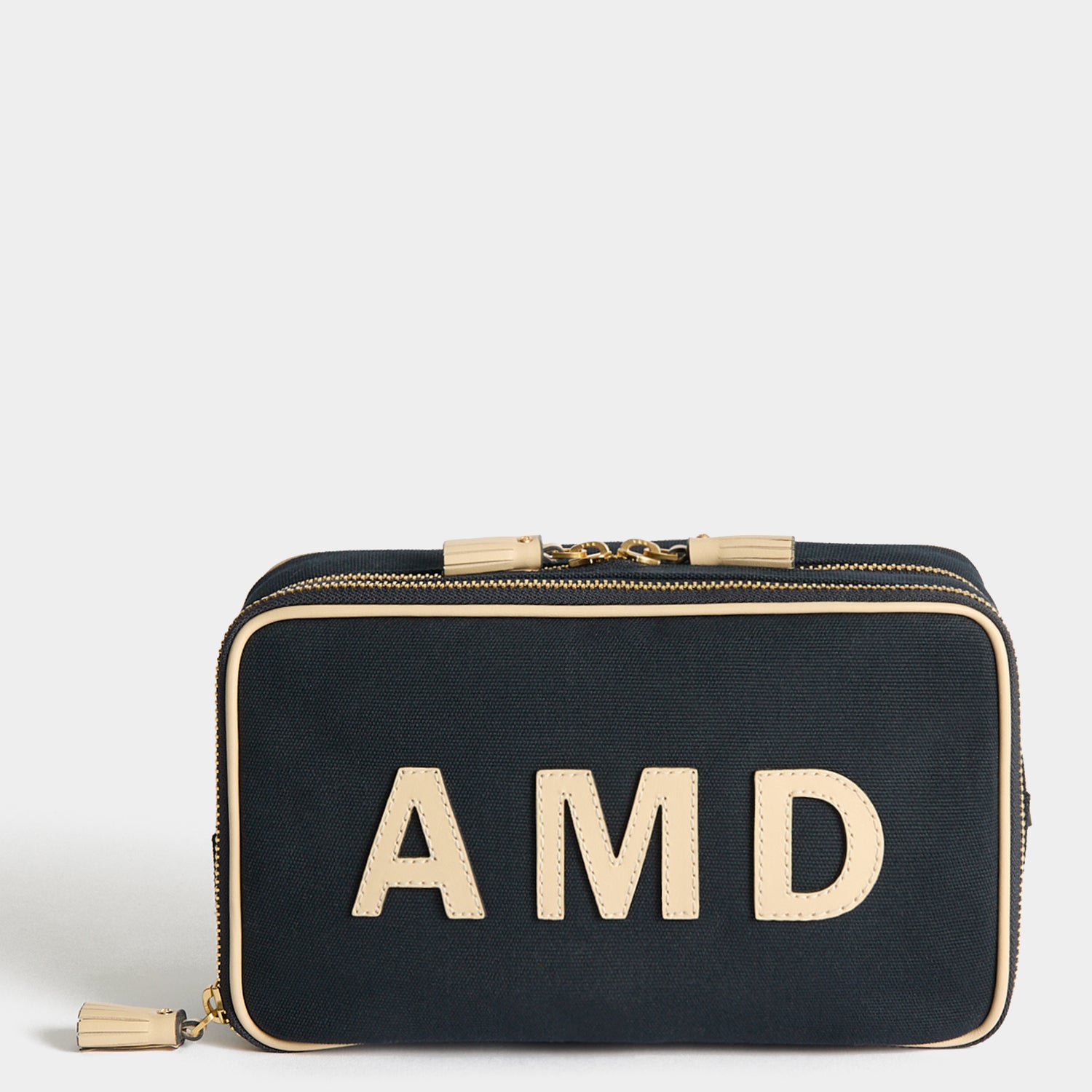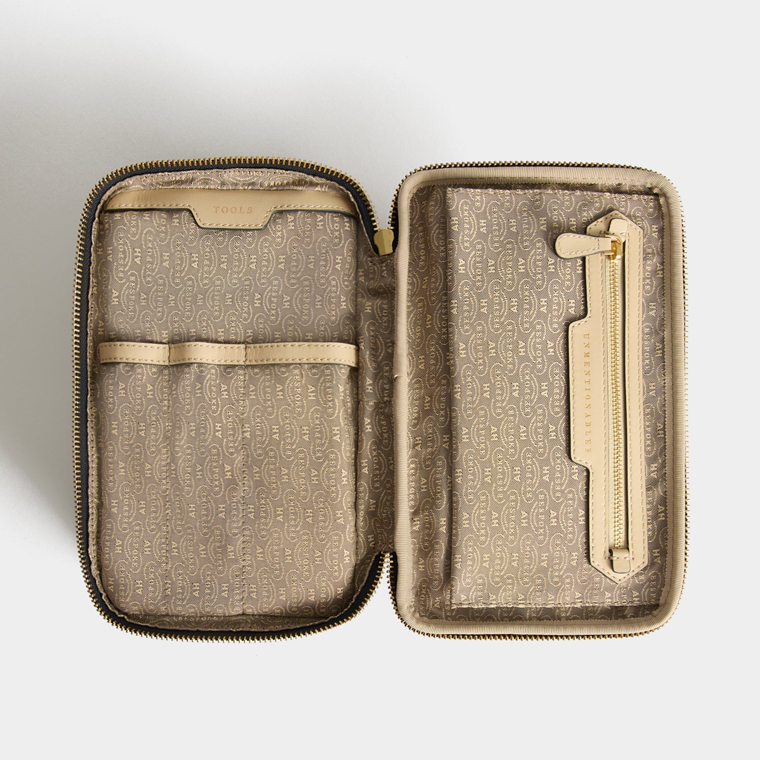 Personalised with an appliquéd leather monogram, our Bespoke Walton Wash Bag offers a stylish way to transport bathroom essentials. It is made from silk calf leather and accented with our trademark tasselled zips. Inside, there are two sections, with labelled compartments for makeup tools, 'unmentionables', and other getting-ready essentials.