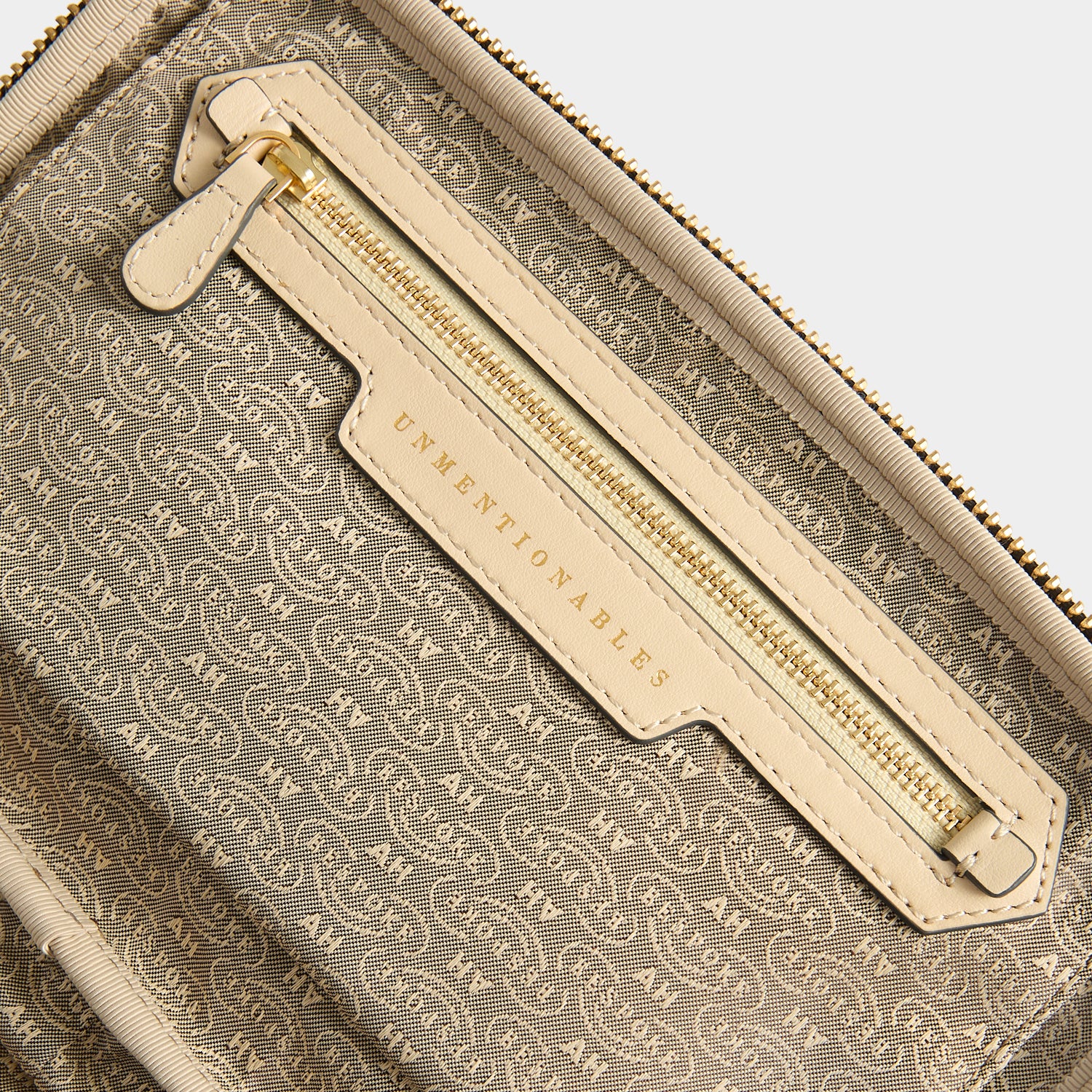Internal features: Two sections. Top section has a zipped pocket labelled 'UNMENTIONABLES' and an open pocket labelled ‘TOOLS’. Main section has a zipped pocket.