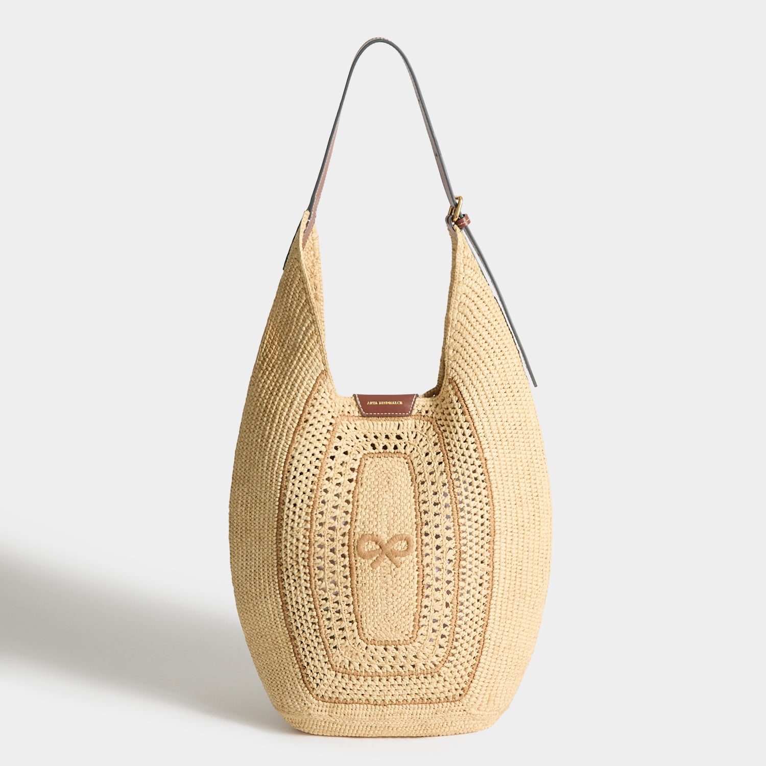A chic take on the classic basket bag, this hobo style is woven from natural raffia and detailed with a tonal bow insignia. It has contrast-stitched, brown leather trims, including an adjustable shoulder strap, magnetic closure, and a whipstitched interior slip pocket for essential cards.