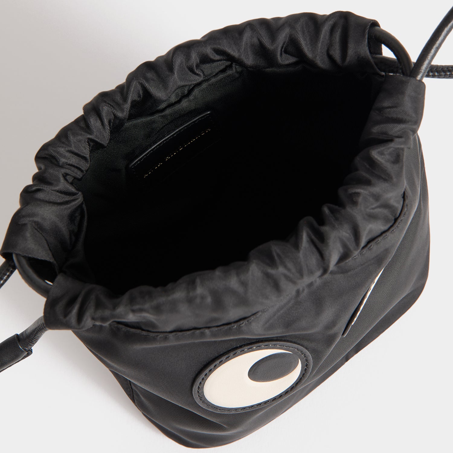 The Eyes Drawstring Pouch will add a touch of fun to evening outfits. It is crafted from ECONYL® regenerated nylon, decorated with a pair of leather eyes, and finished with drawstring ties, which can be looped around the wrist. Inside, there’s room for a phone, cardholder, keys and a couple of essential makeup items.