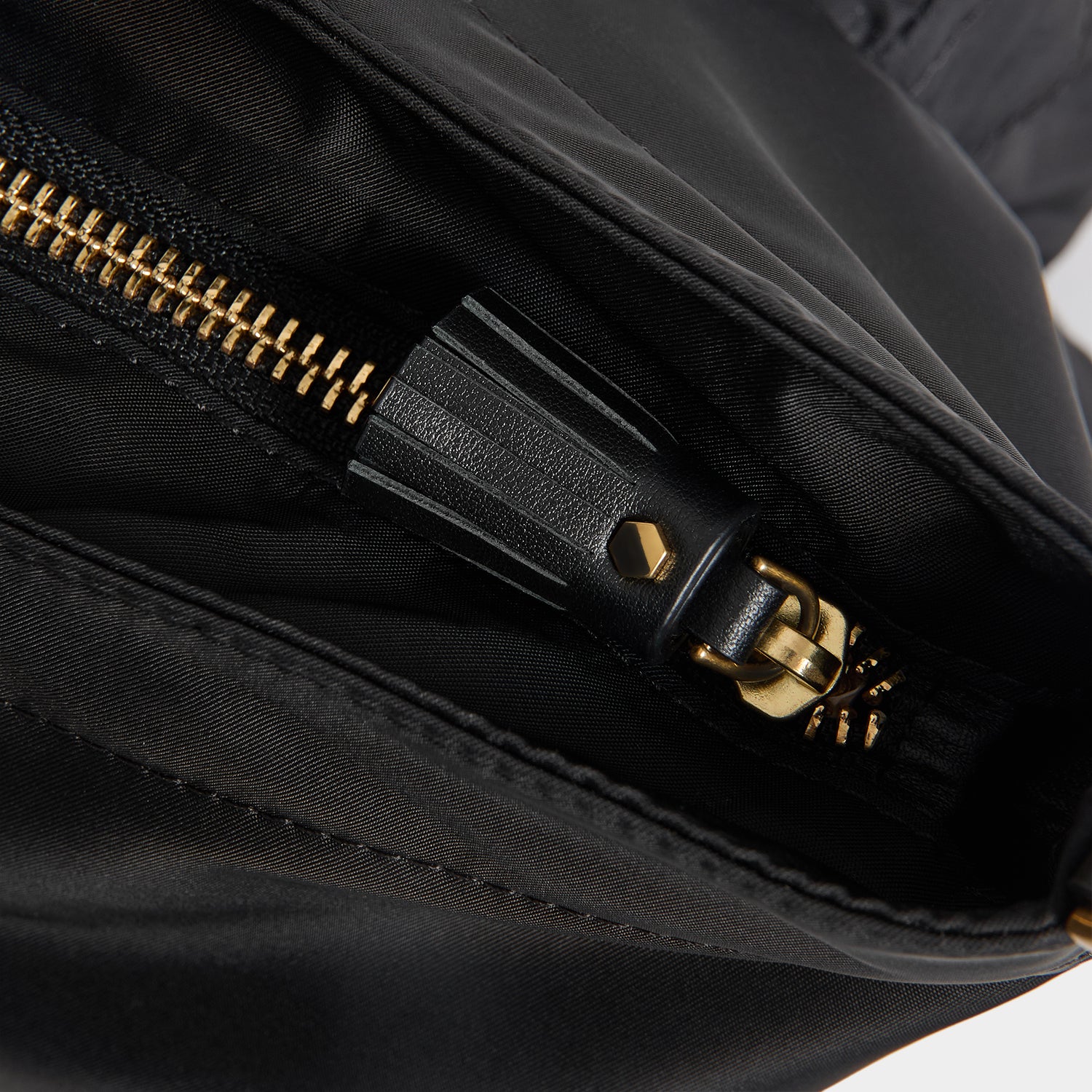 External features: Eyes detail, front pocket with contrasting lining, cross-body strap, tassel zip closure with gold hardware