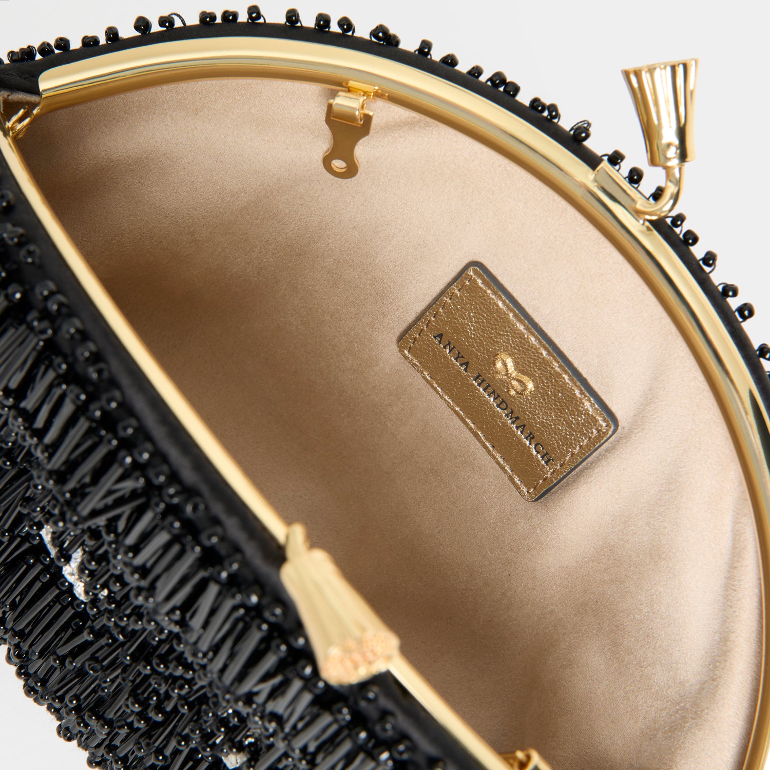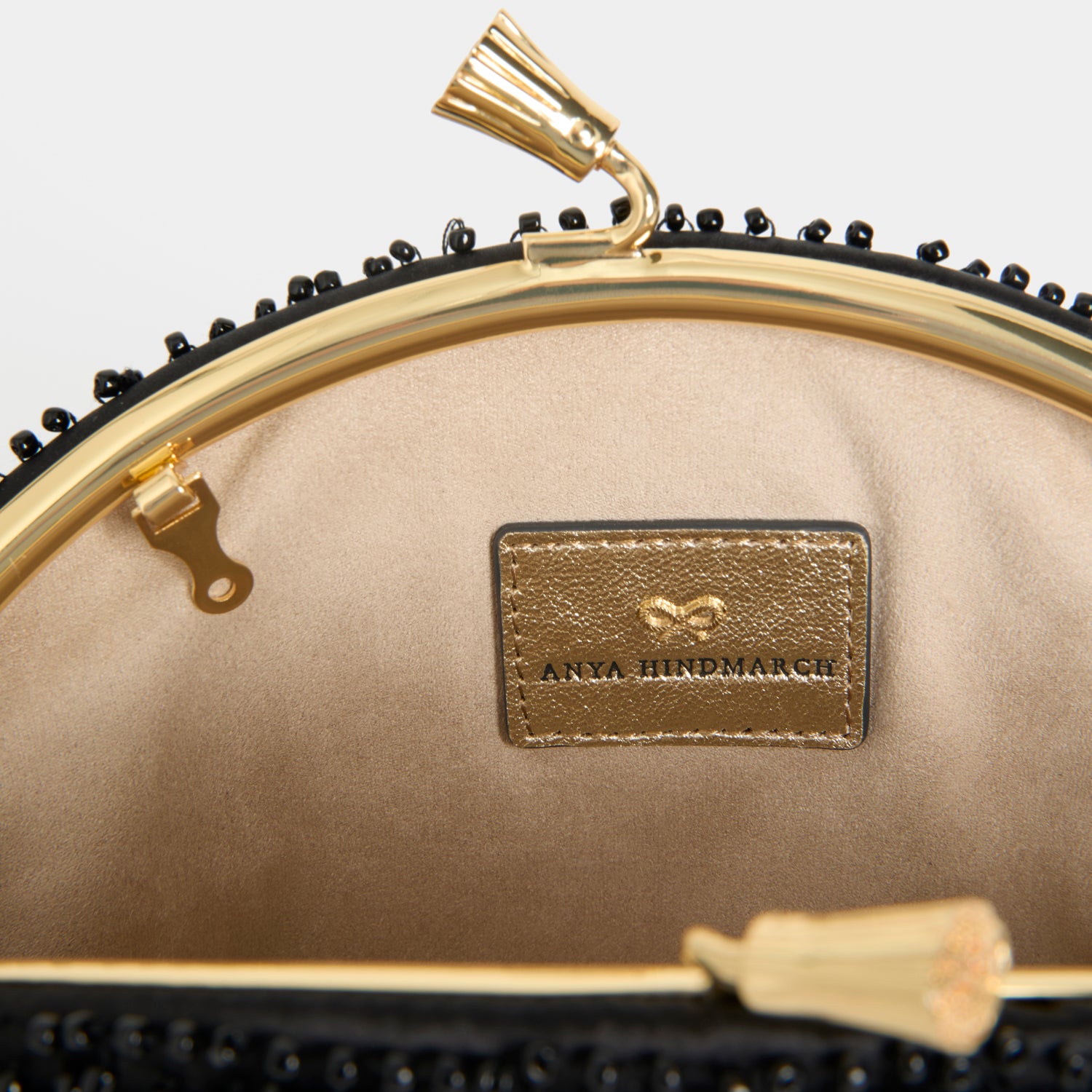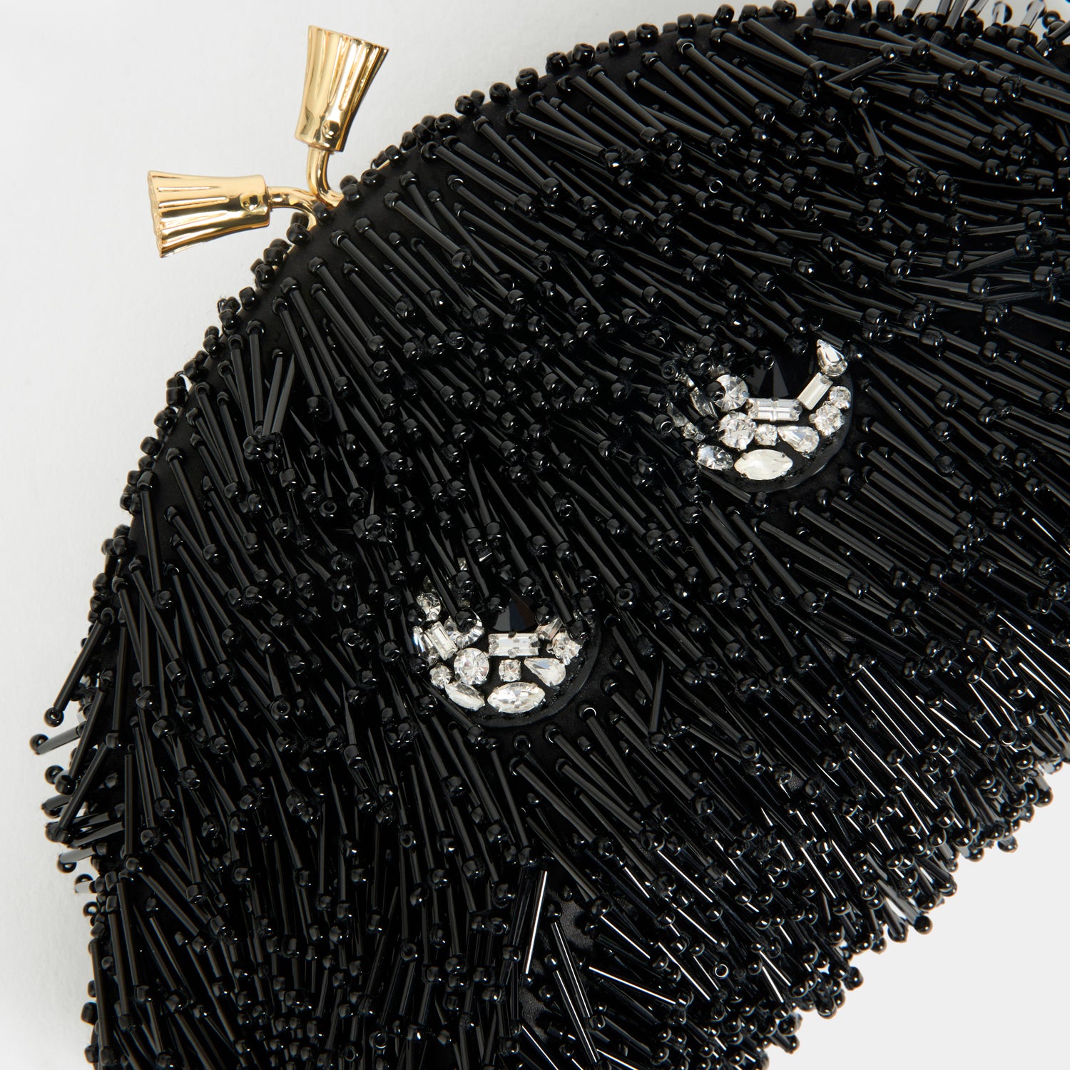 Look twice at this bead-embellished satin clutch and you’ll see a pair of crystal-encrusted eyes, making it a playful addition to evening outfits. The intricate craftsmanship extends to the smaller details, like the tassel-shaped clasp fastenings and gold bow-adorned logo patch inside. It’s perfectly sized for after-dark essentials and can be clutched or carried by the detachable chain strap.