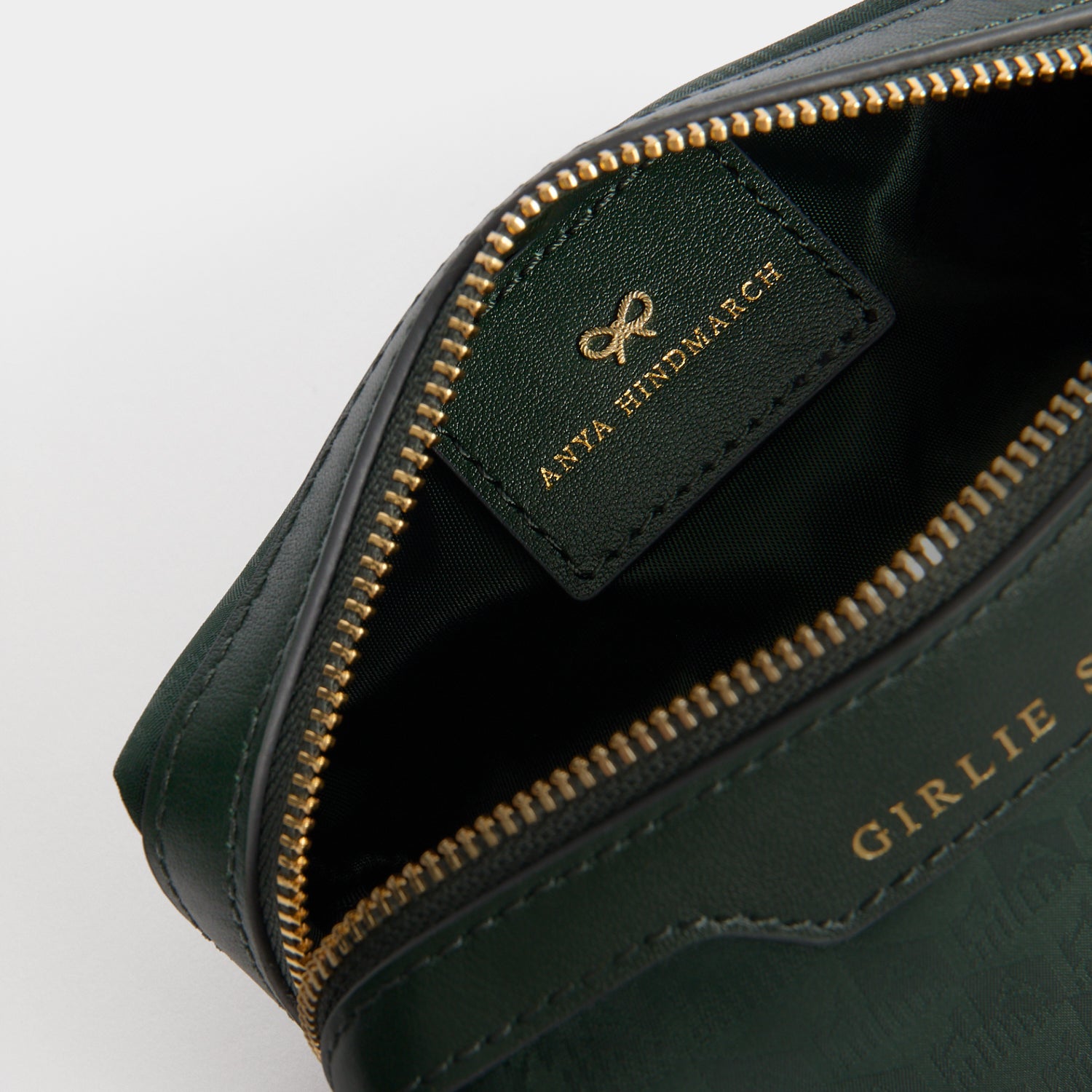 External features: Leather nameplate labelled with 'GIRLIE STUFF' embossing, gold-tone zip with tassel zip pull, Anya Hindmarch bow, AH fabric embossing