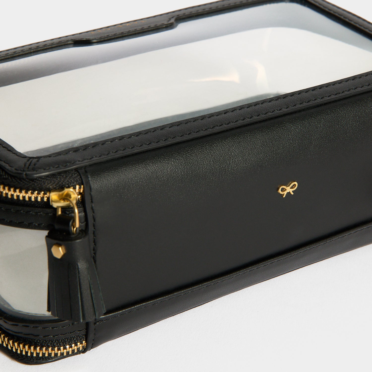 This clear In-Flight Case is the perfect travel accessory. With a clear exterior to help you instantly find what you're looking for, the case has two zipped compartments; one for all those essentials to keep you feeling comfortable on take-off and one for those little touches when you arrive. Beautifully finished with patent trim, signature tassel zip fastenings and Anya Hindmarch bow.