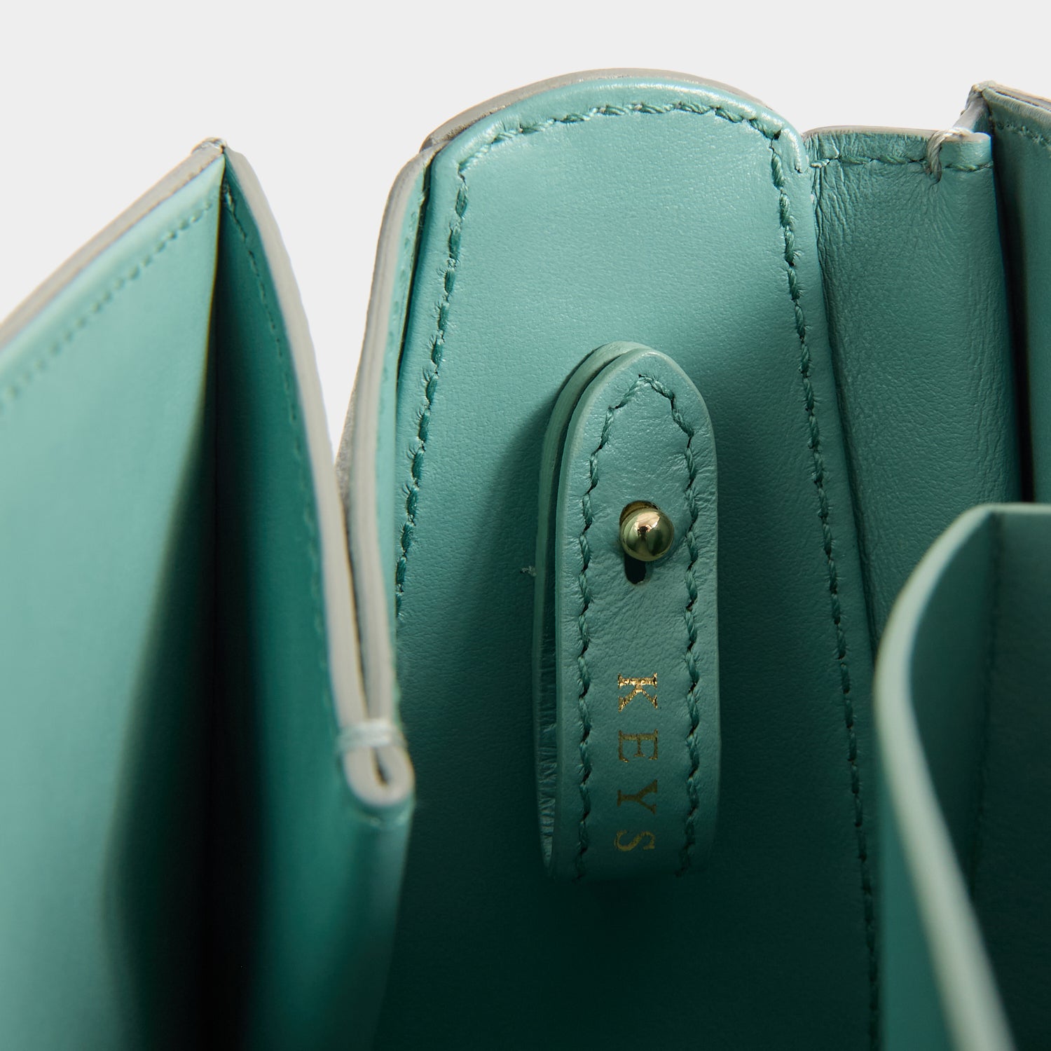 The Mortimer Clutch is the result of hours of handcraftsmanship. It is made in Florence from iceberg-green silky calf leather that has a gold rating from the Leather Working Group – the highest certification a tannery can receive for environmental and social practices. The interior is lined in tonal leather and fitted with a pocket for your phone, a smaller compartment for a lipstick, and a gold mirror – with its own labelled slot. Carry it as a clutch, cross-body or over the shoulder, adding a charm or two to the D-ring for a personalised touch.