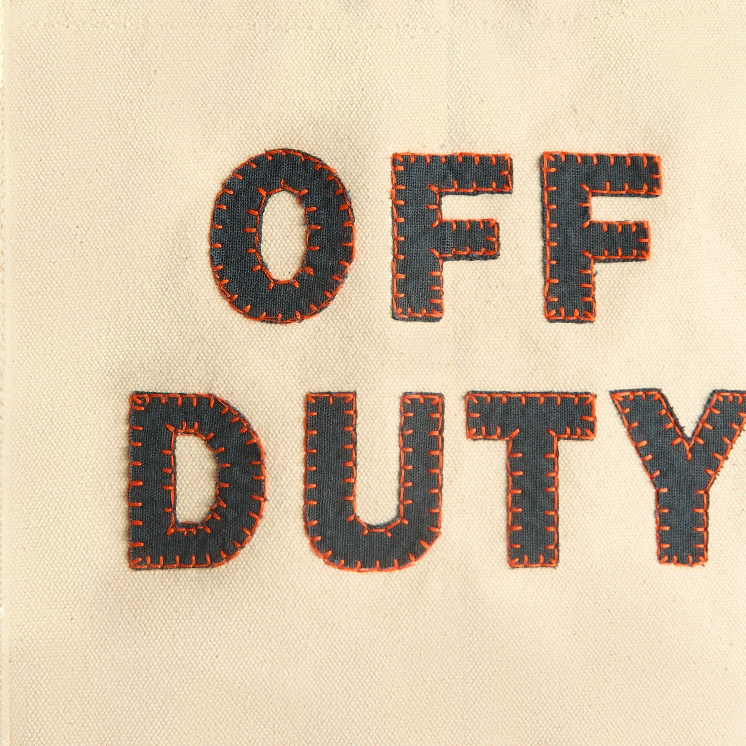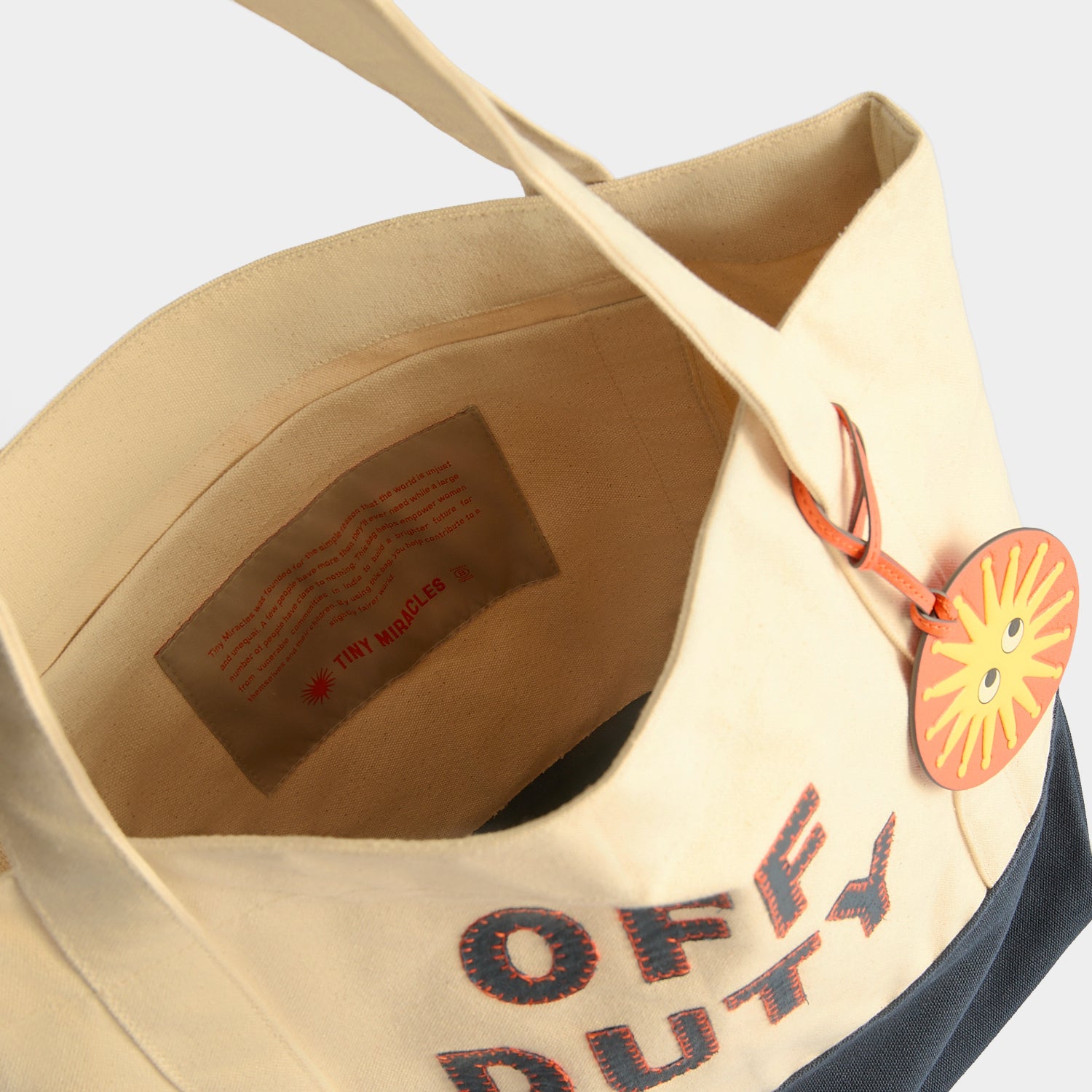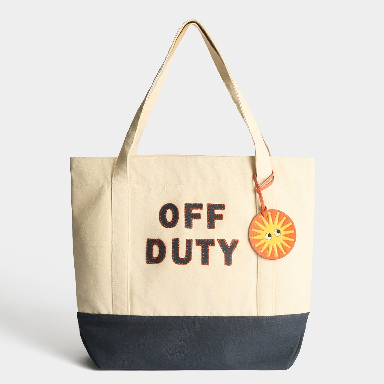 External features: Blue letters spelling 'OFF DUTY', canvas handles, leather sun charm and leather tab with logo