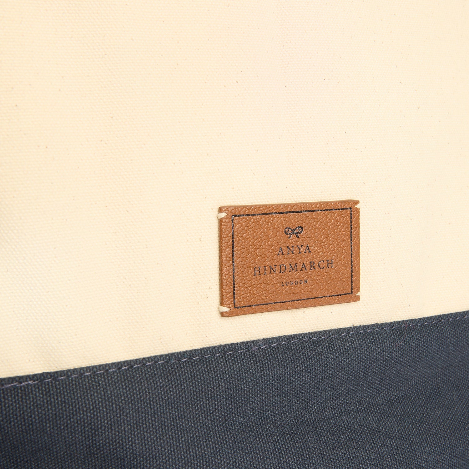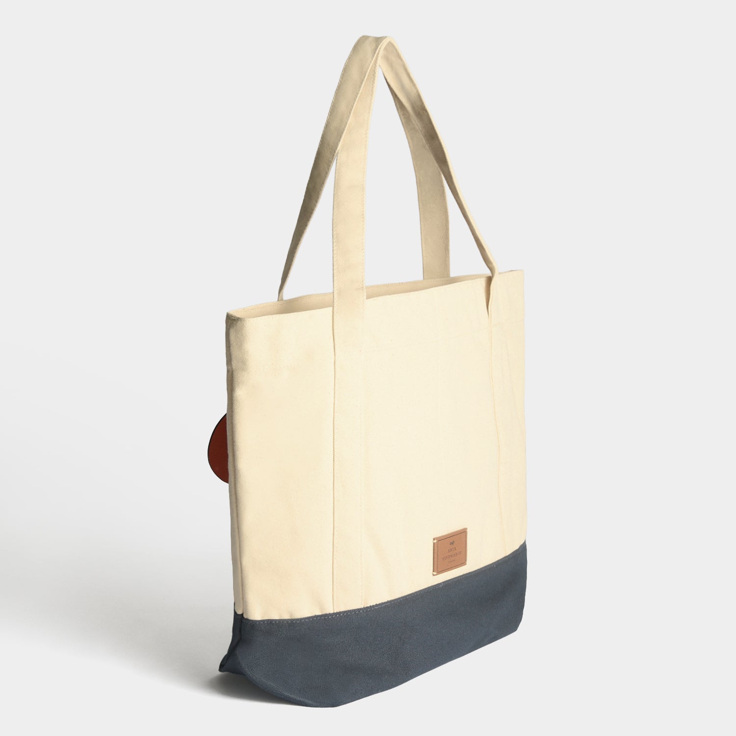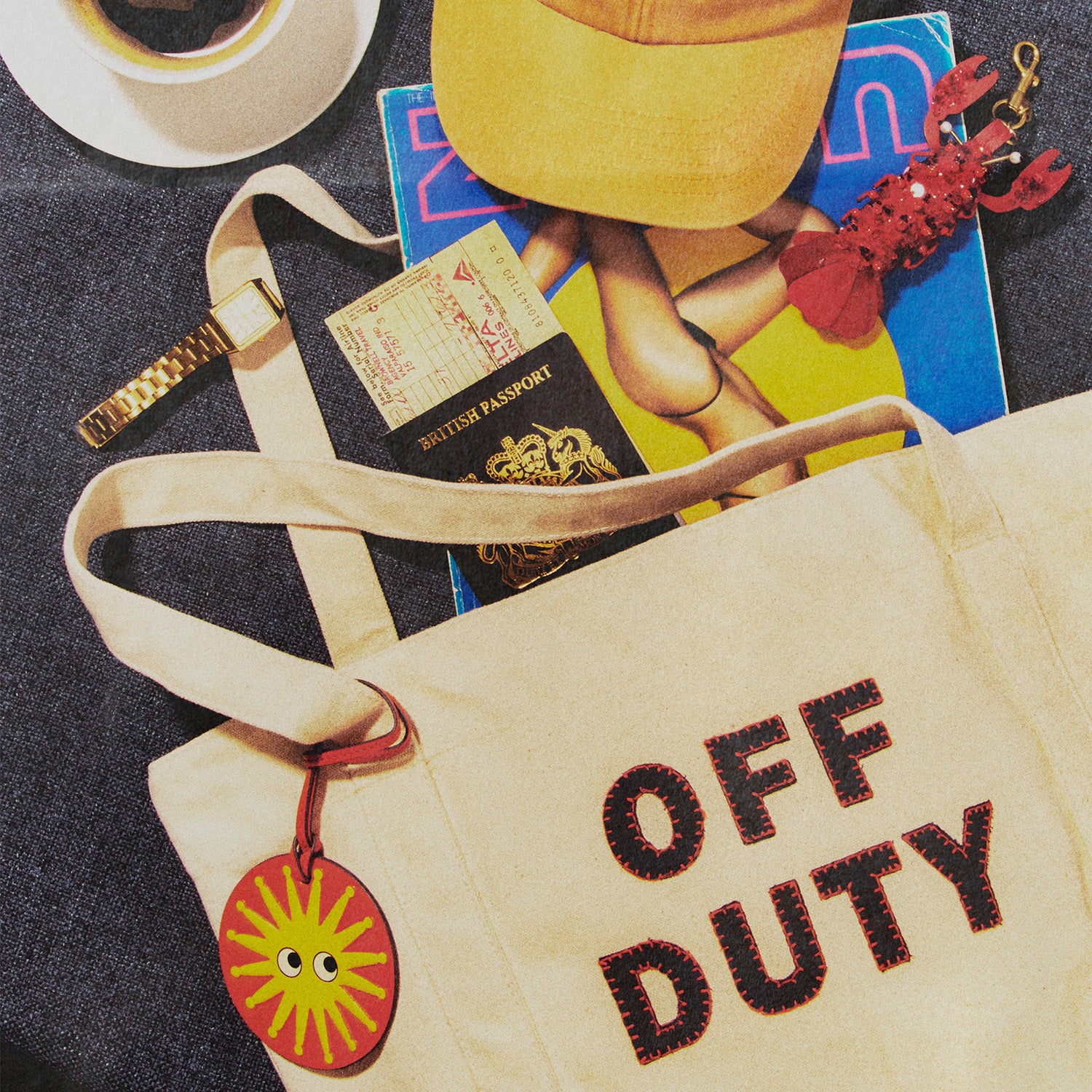 External features: Blue letters spelling 'OFF DUTY', canvas handles, leather sun charm and leather tab with logo