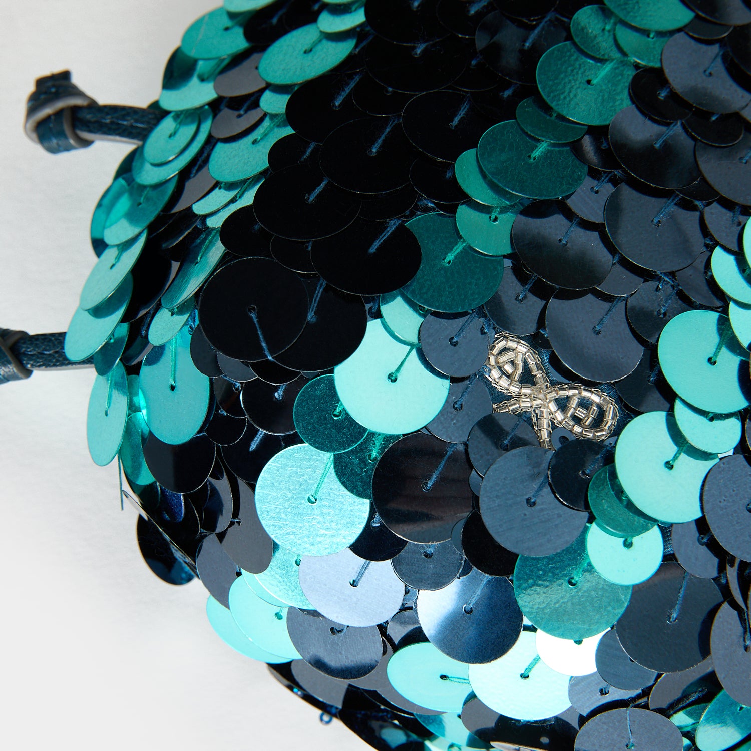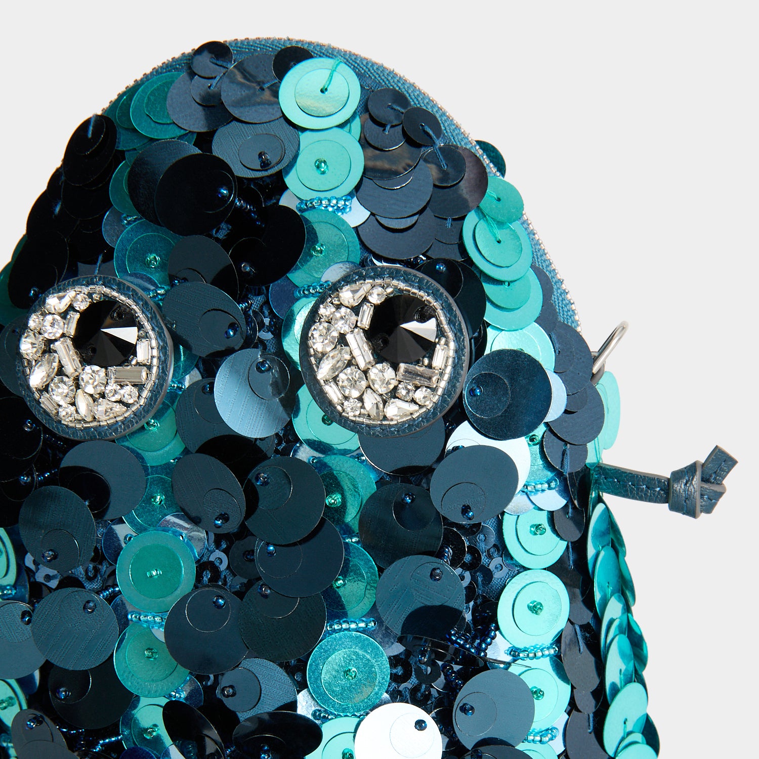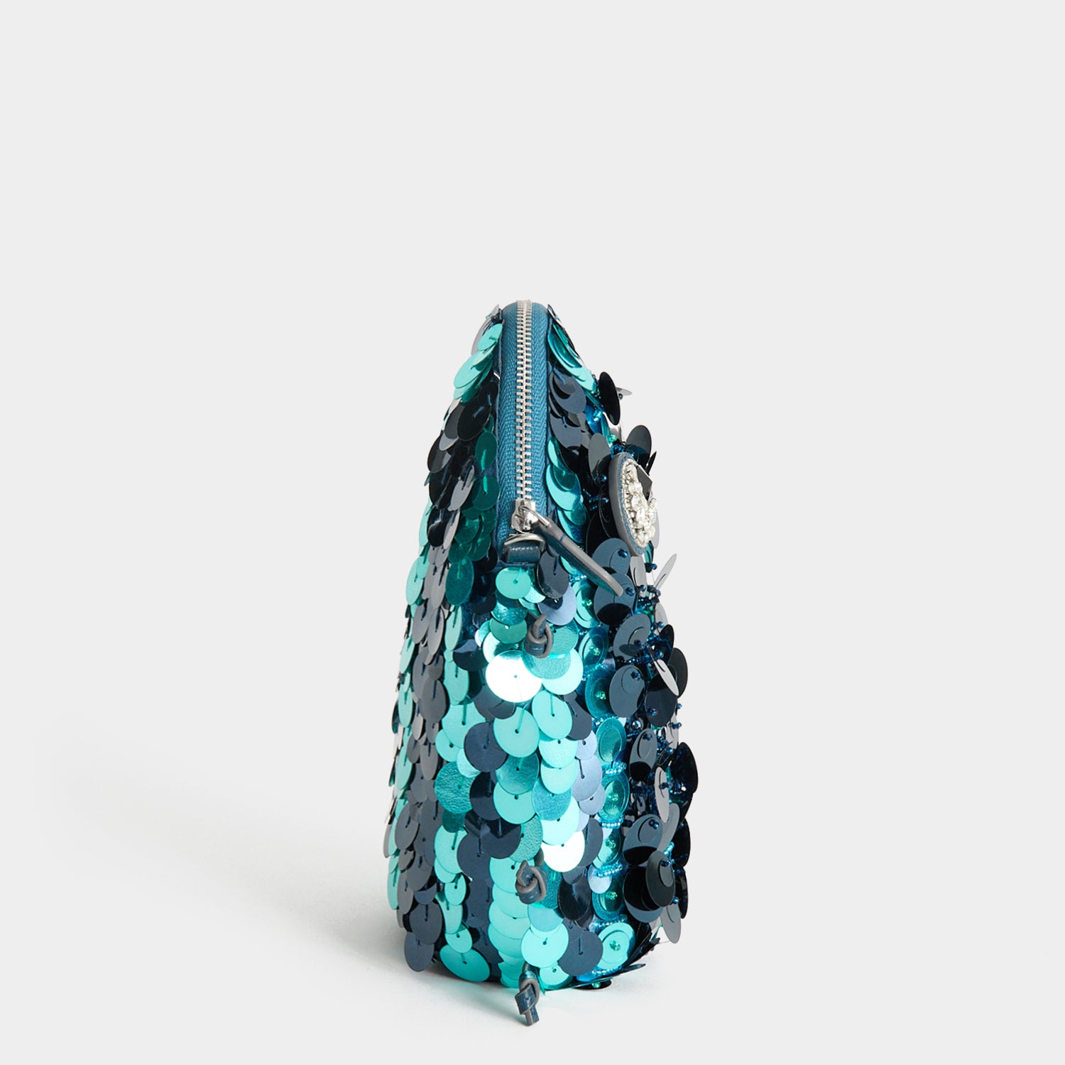 - DESCRIPTION- Embellished with scores of tonal sequins and crystal-encrusted eyes, the Bug Pouch is as intricately crafted as it is playful. Wear it cross-body by the chain strap for evening events, or wear as a clutch using the detachable wrist strap, keeping your phone, keys, cards and a couple of makeup items inside the dark petrol-blue satin interior. - Item number: 5050925204361