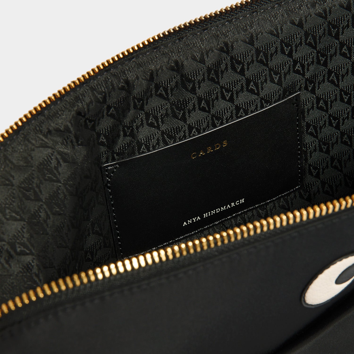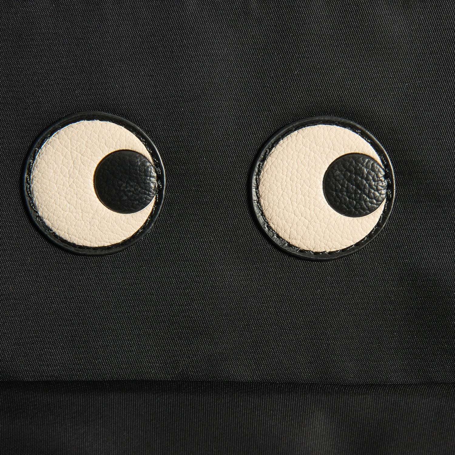 External features: Eyes detail, zip-pull with leather tabs, zipped front pocket with contrasting lining