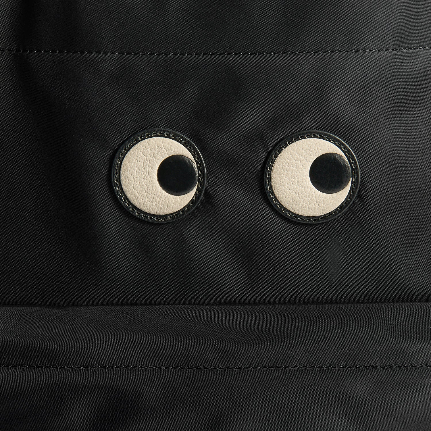 External features: Eyes detail, zip-pull with leather tabs, zipped front pocket with contrasting lining