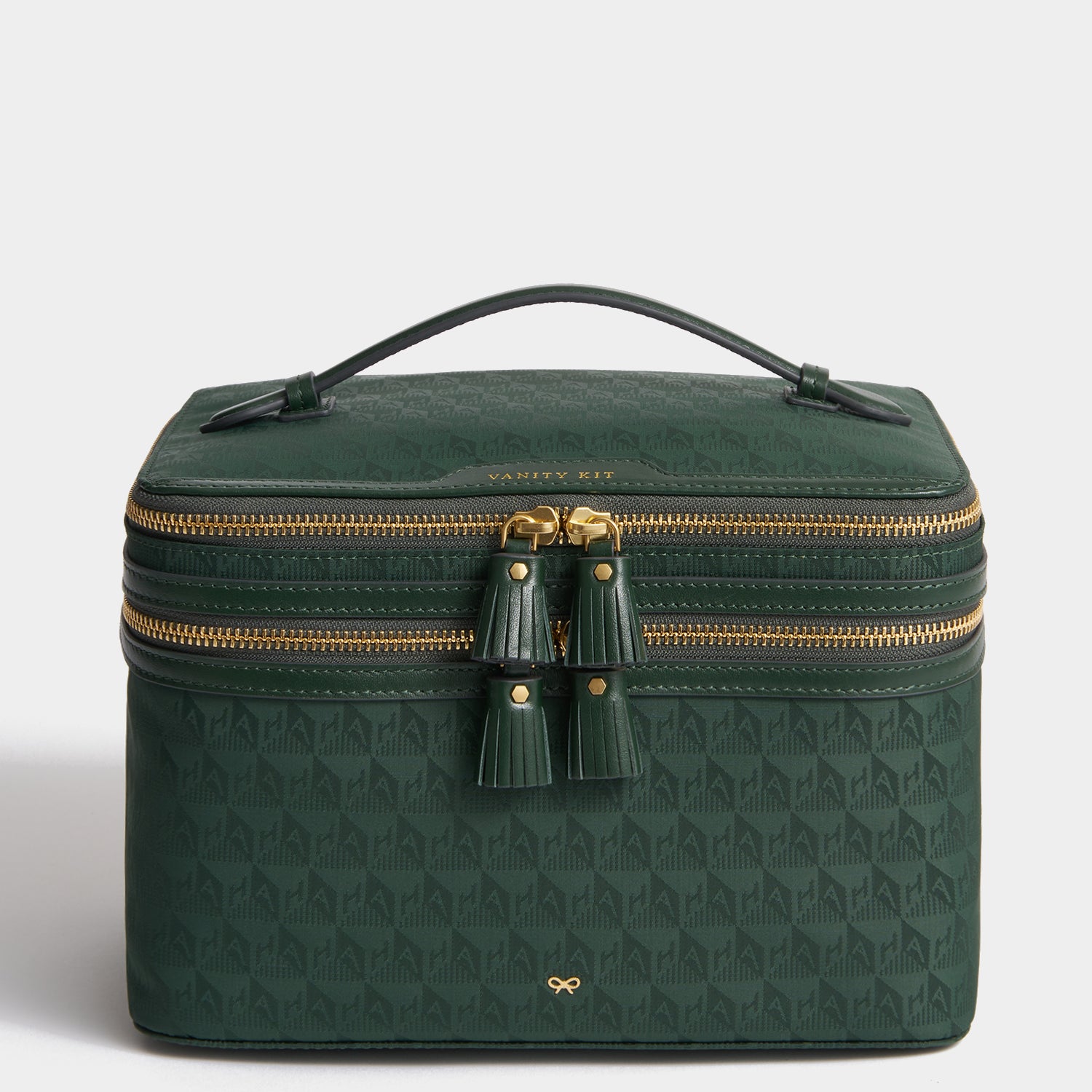 External features: Leather nameplate labelled with 'VANITY KIT' embossing, gold-tone zip with tassel zip pull, Anya Hindmarch bow, AH fabric embossing