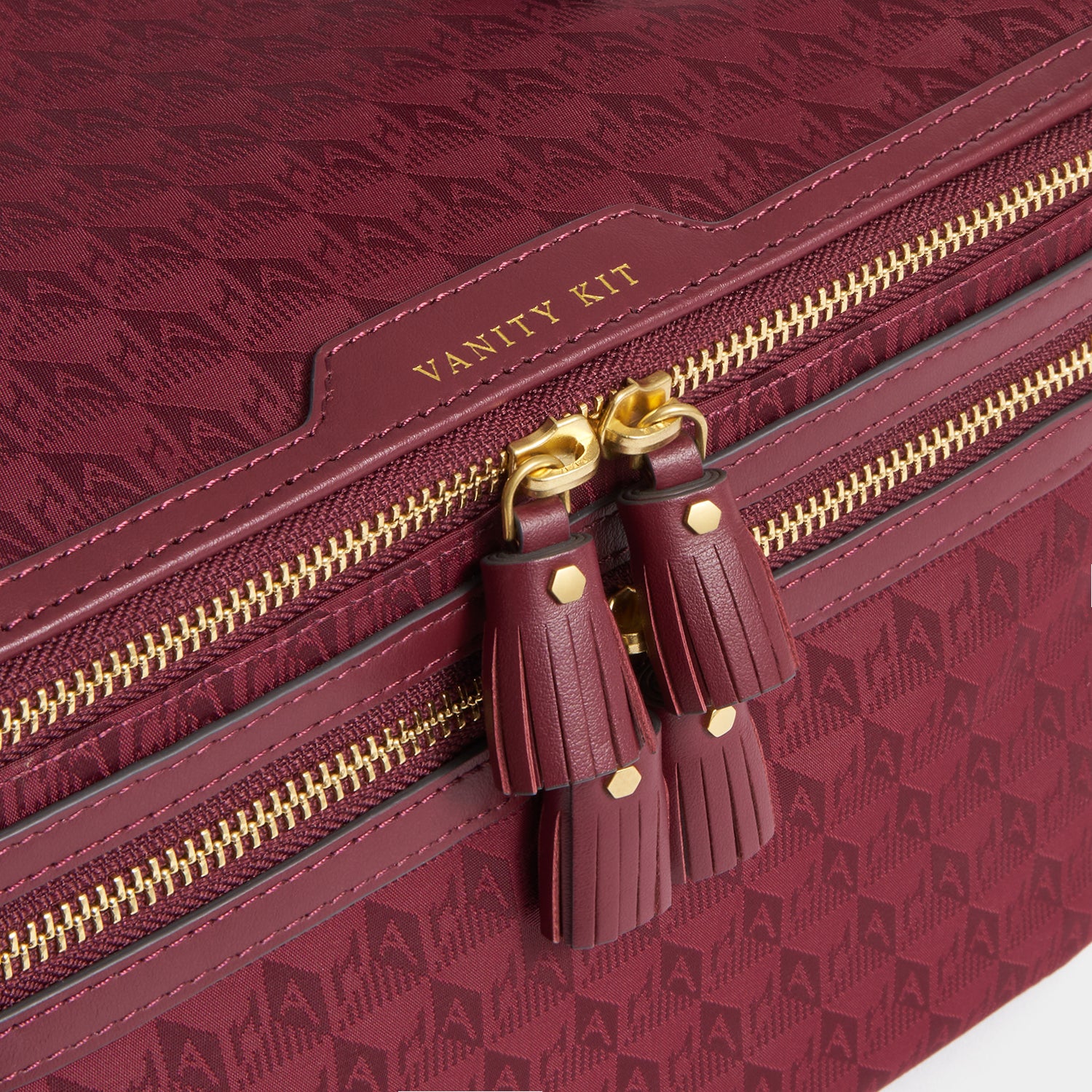 External features: Nameplate with VANITY KIT embossed, two sections, gold-tone zips with leather zip pulls