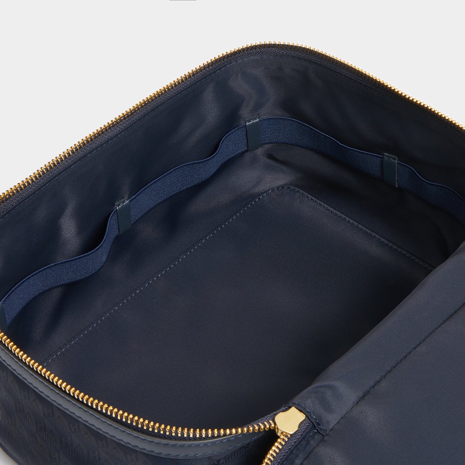 Our Logo Vanity Kit will keep make-up and skincare essentials immaculately organised while you're away from home. In luxurious yet durable nylon, it has two zipped compartments – a shallow section for 10 make-up brushes and other small bits, and a roomier tier for lotions, potions, and more. Tasselled zips, a golden bow and embossed labels finish everything off nicely. It makes getting ready (or unready) a breeze.