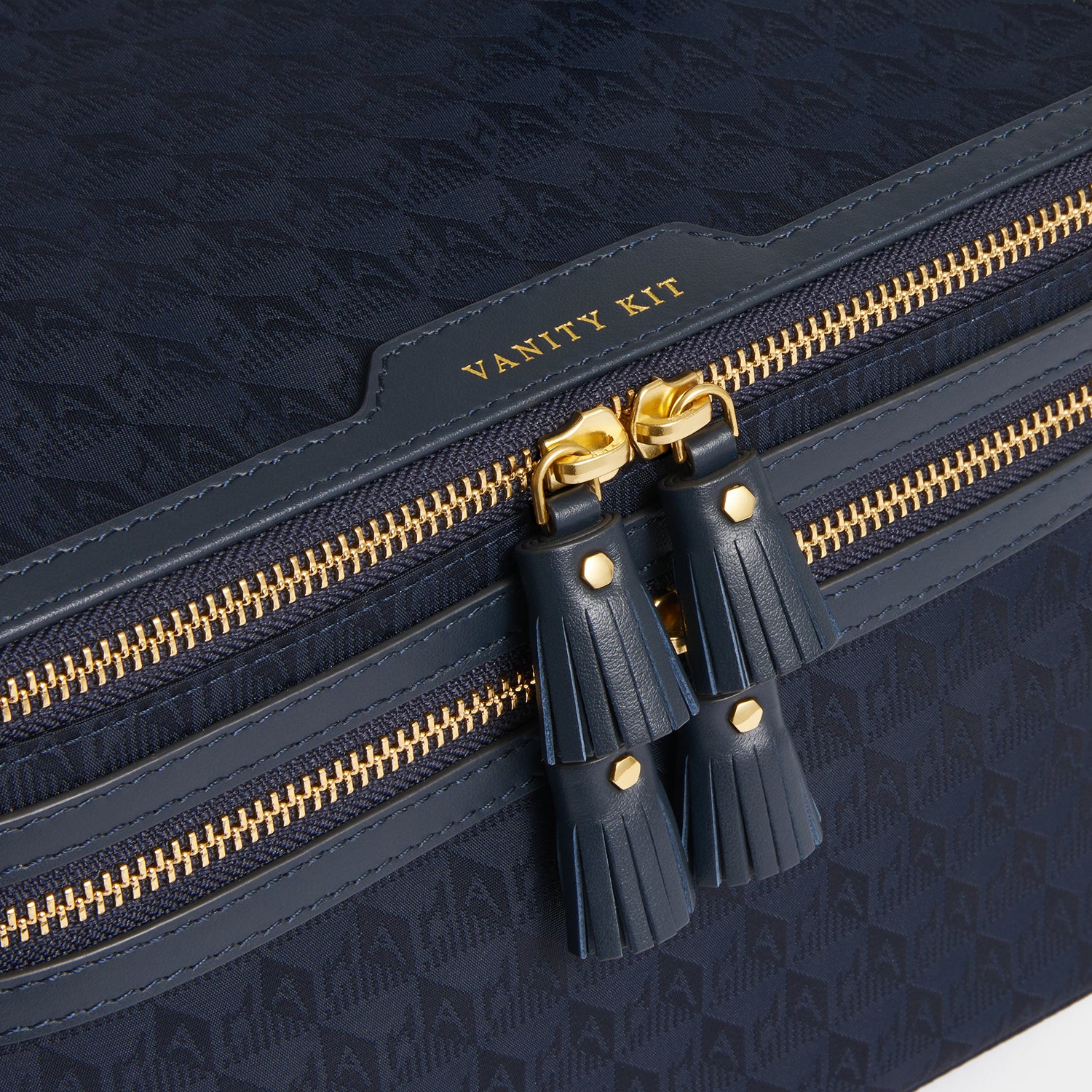 External features: Leather nameplate labelled with 'VANITY KIT' embossing, gold-tone zip with tassel zip pull, Anya Hindmarch bow, AH fabric embossing