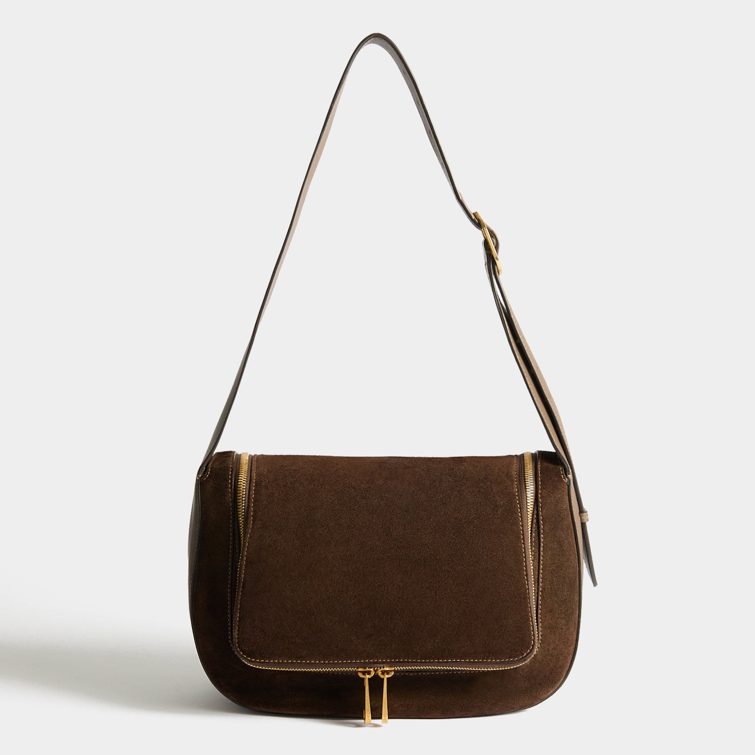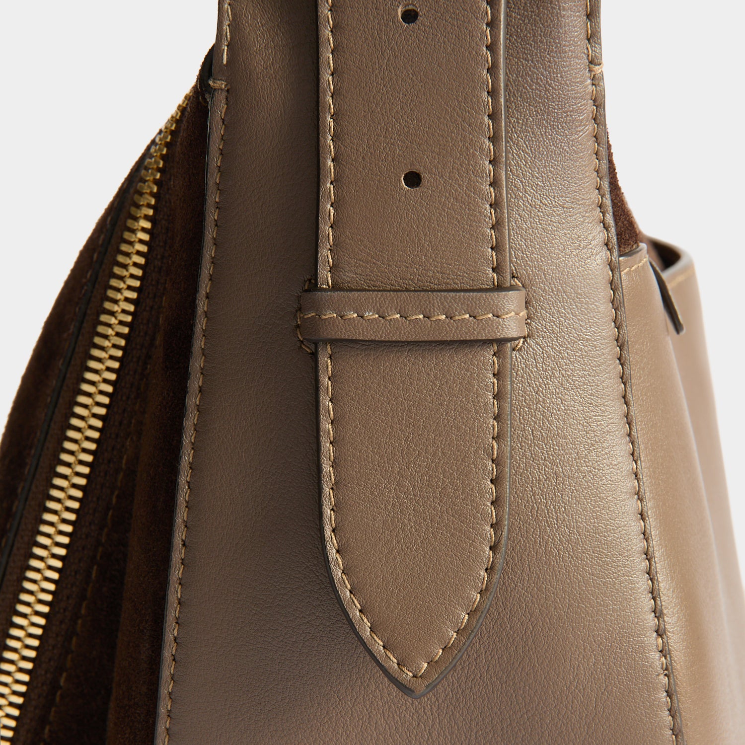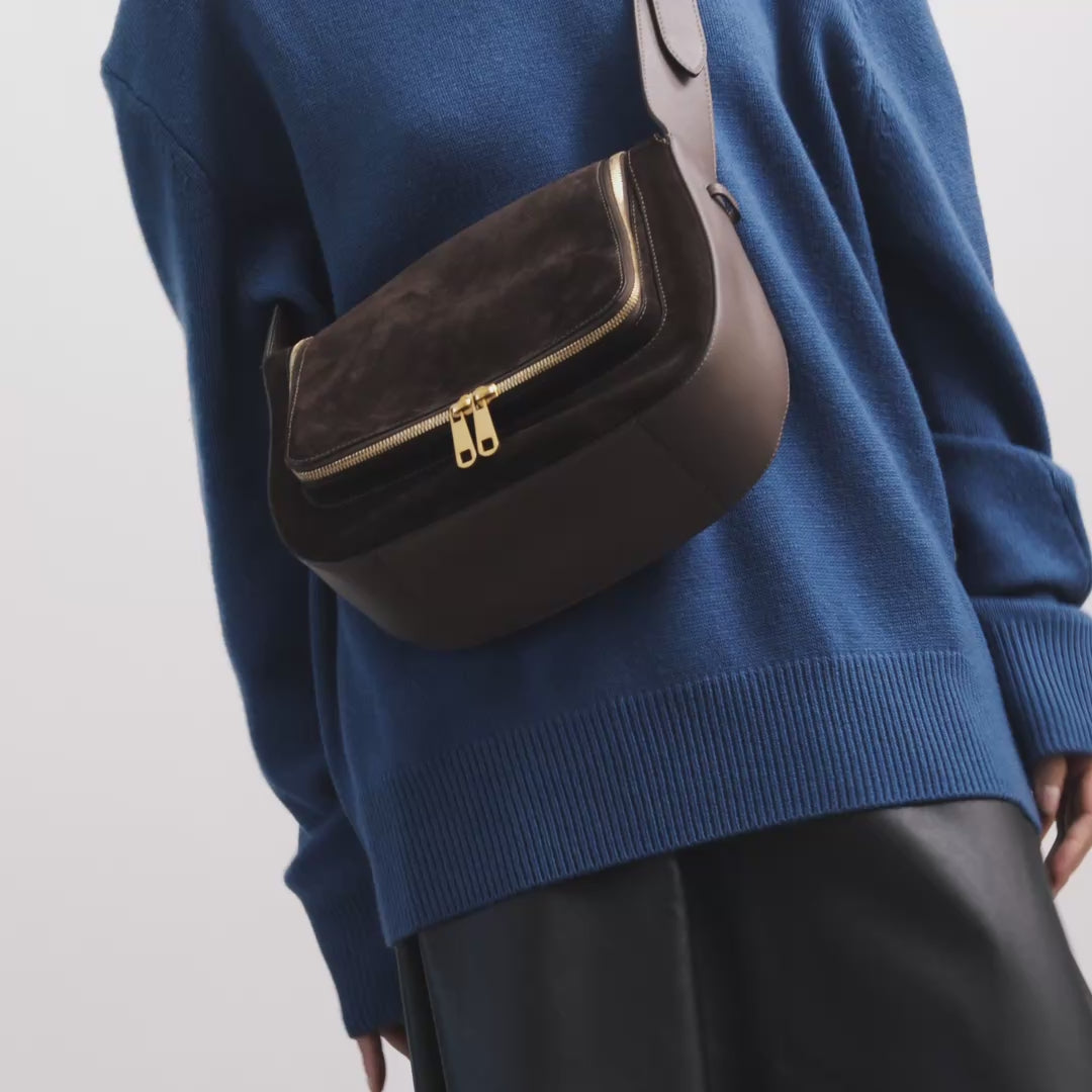 We've reimagined the much-loved Vere Shoulder Bag with a longer strap, designed to be worn crossbody. Crafted from truffle-coloured suede and silky calf leather, it opens via a double zip to reveal labelled sections in vampire-red leather for your phone, glasses, earphones, keys, receipts, and cards. There's additional space for a makeup bag, stationery and other essentials, as well as a zippered pocket for smaller items.